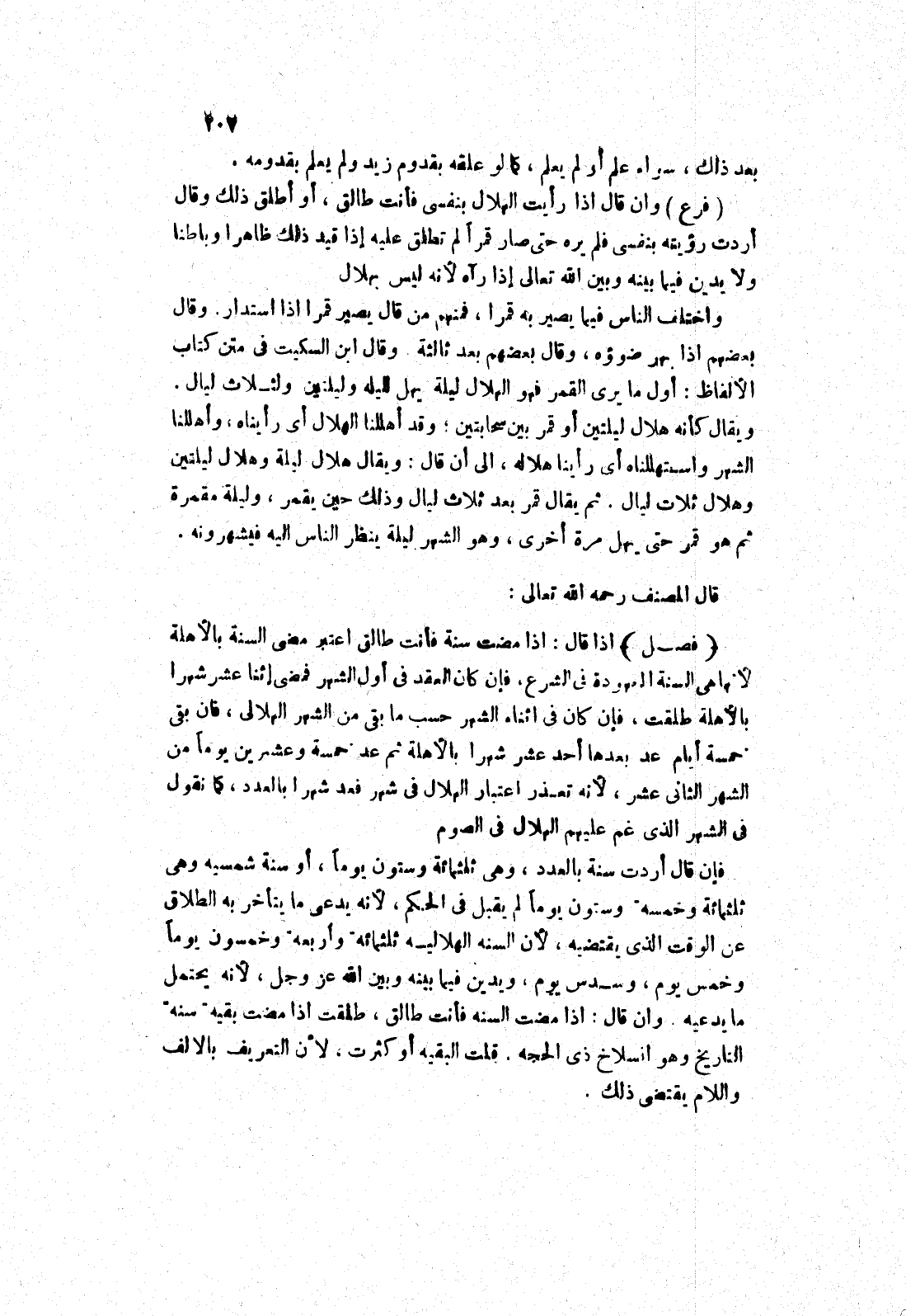 وان قال إذا رأيت الهلال بنفسى فأنت طالق، أو أطلق ذلك وقال أردت رؤيته بنفسى فلم يره حتى صار قمرا لم تطلق عليه إذا قيد ذلك ظاهرا وباطنا ولا يدين فيما بينه وبين الله تعالى إذا رآه لانه ليس بهلال واختلف الناس فيما يصير به قمرا، فمنهم من قال يصير قمرا إذا استدار.
