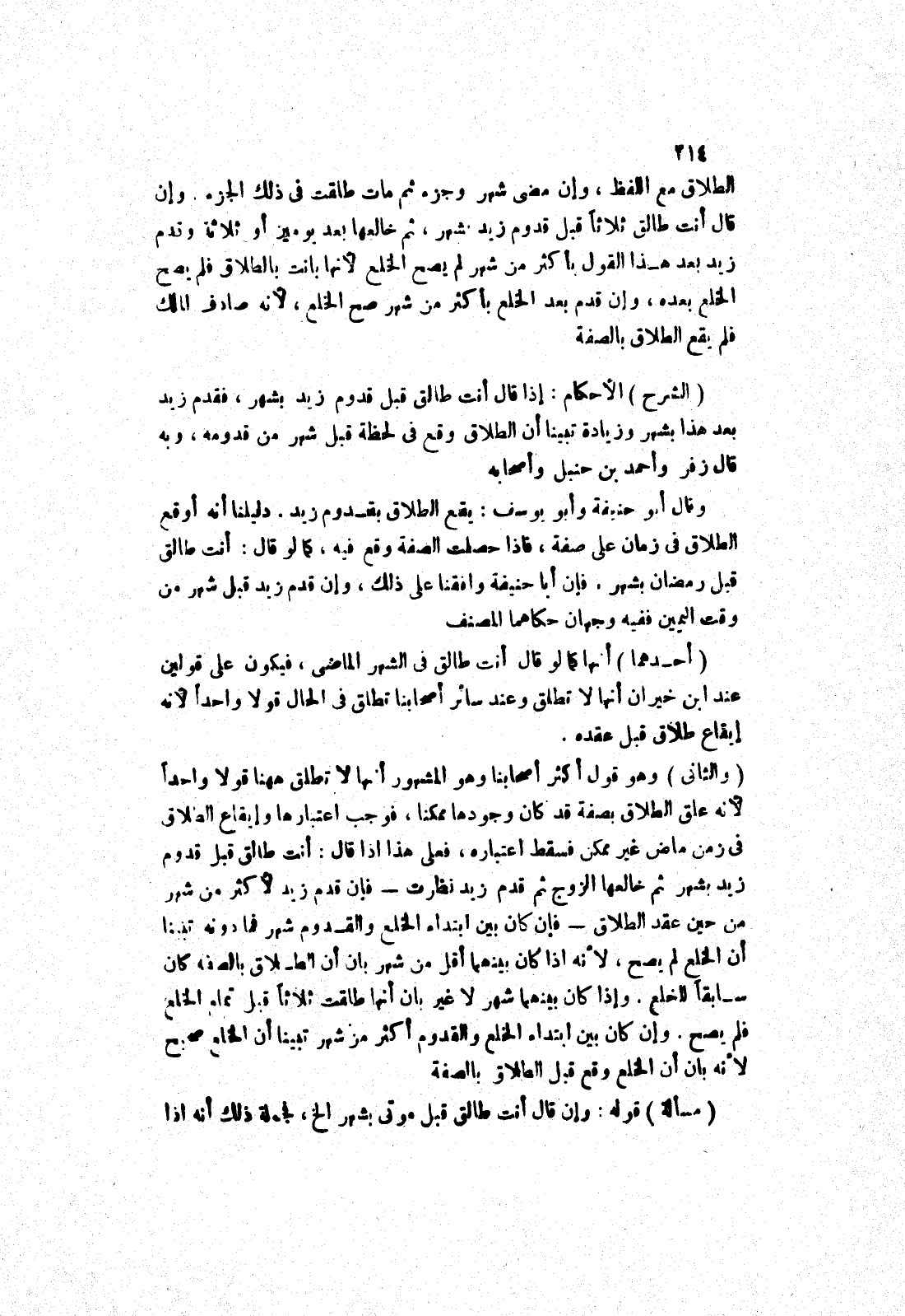 وإن قال أنت طالق ثلاثا قبل قدوم زيد بشهر، ثم خالعها بعد يومين أو ثلاثة وقدم زيد بعد هذا القول بأكثر من شهر لم يصح الخلع لانها بانت بالطلاق فلم يصح الخلع بعده، وإن قدم بعد الخلع بأكثر من شهر صح الخلع، لانه صادف الملك فلم يقع الطلاق بالصفة (الشرح) الاحكام: إذا قال أنت طالق قبل قدوم زيد بشهر، فقدم زيد بعد هذا بشهر وزيادة تبينا أن الطلاق وقع في لحظة قبل شهر من قدومه، وبه قال زفر وأحمد بن حنبل وأصحابه وقال أبو حنيفة وأبو يوسف: يقع الطلاق بقدوم زيد.