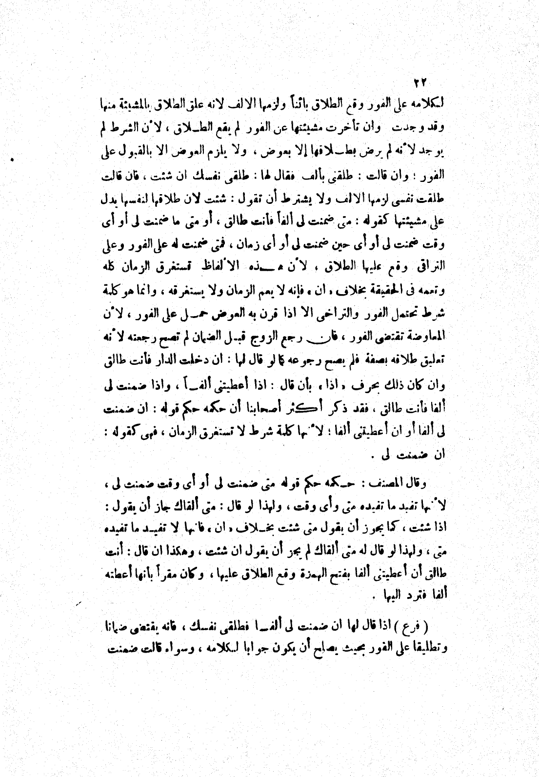 طلقت نفسي لزمها الالف ولا يشترط أن تقول: شئت لان طلاقها لنفسها يدل على مشيئتها كقوله: متى ضمنت لى ألفا فأنت طالق، أو متى ما ضمنت لى أو أي وقت ضمنت لى أو أي حين ضمنت لى أو أي زمان، فمتى ضمنت له على الفور وعلى التراقي وقع عليها الطلاق، لان هذه الالفاظ تستغرق الزمان كله وتعمه في الحقيقة بخلاف " ان " فإنه لا يعم الزمان ولا يستغرقه، وانما هو كلمة شرط تحتمل الفور والتراخى الا إذا قرن به العوض حمل على الفور، لان المعاوضة تقتضي الفور، فان رجع الزوج قبل الضمان لم تصح رجعته لانه تعليق طلاقه بصفة فلم يصح رجوعه كما لو قال لها: ان دخلت الدار فأنت طالق وان كان ذلك بحرف " إذا " بأن قال: إذا أعطيتني ألفا، وإذا ضمنت لى ألفا فأنت طالق، فقد ذكر أكثر أصحابنا أن حكمه حكم قوله: أن ضمنت لى ألفا أو ان أعطيتني ألفا، لانها كلمة شرط لا تستغرق الزمان، فهى كقوله: ان ضمنت لى.