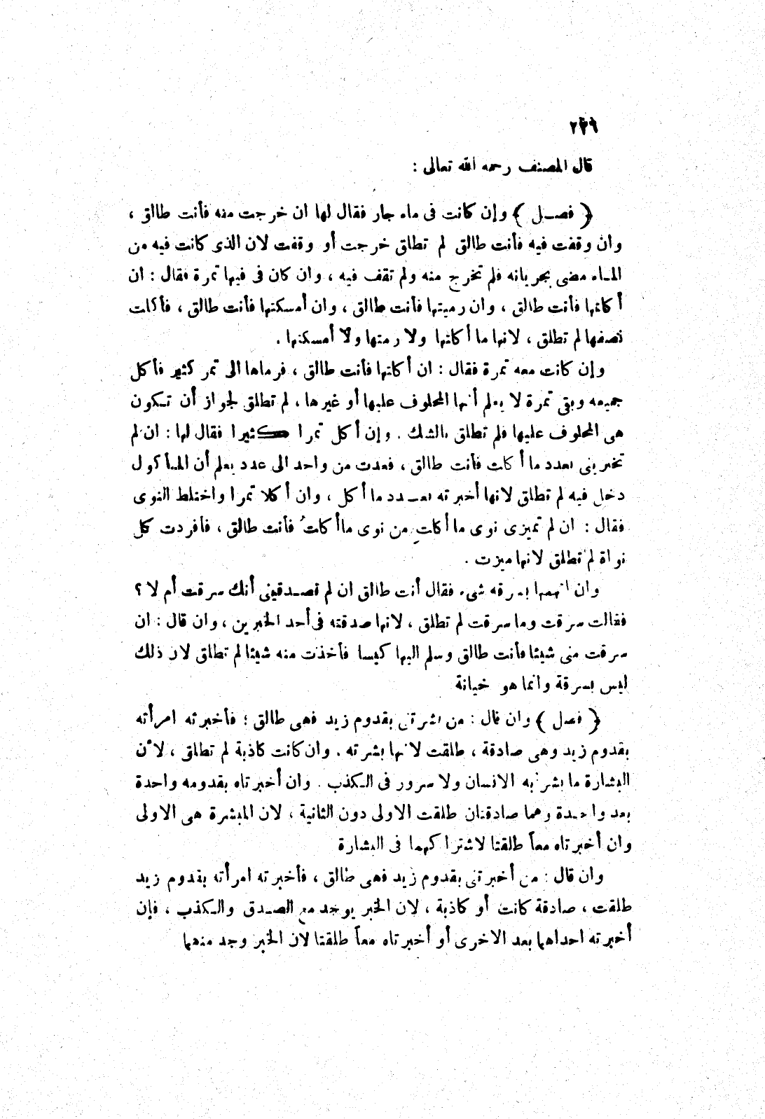 وان كانت كاذبة لم تطلق، لان البشارة ما بشر به الانسان ولا سرور في الكذب، وان أخبرتاه بقدومه واحدة بعد واحدة وهما صادقتان طلقت الاولى دون الثانية، لان المبشرة هي الاولى وان أخبرتاه معا طلقتا لاشتراكهما في البشارة وان قال: من أخبرتى بقدوم زيد فهى طالق، فأخبرته امرأته بقدوم زيد طلقت، صادقة كانت أو كاذبة، لان الخبر يوجد مع الصدق والكذب، فإن أخبرته احداهما بعد الاخرى أو أخبرتاه معا طلقتا لان الخبر وجد منهما