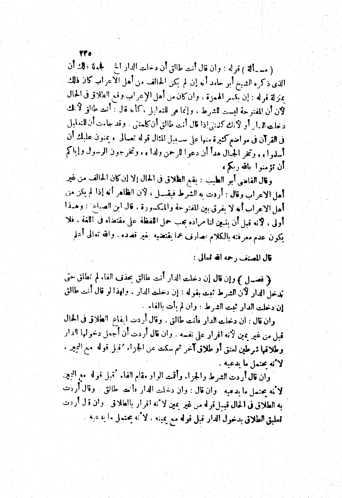 وقد جاءت أن للتعليل في القرآن في مواضع كثيرة منها على سبيل المثال قوله تعالى " يمنون عليك أن أسلموا " " وتخر الجبال هدا أن دعوا للرحمن ولدا " " وتخرجون الرسول وإياكم أن تؤمنوا بالله ربكم " وقال القاضى أبو الطيب: يقع الطلاق في الحال إلا إن كان الحالف من غير أهل الاعراب وقال: أردت به الشرط فيقبل، لان الظاهر أنه إذا لم يكن من أهل الاعراب أنه لا يفرق بين المفتوحة والمكسورة.