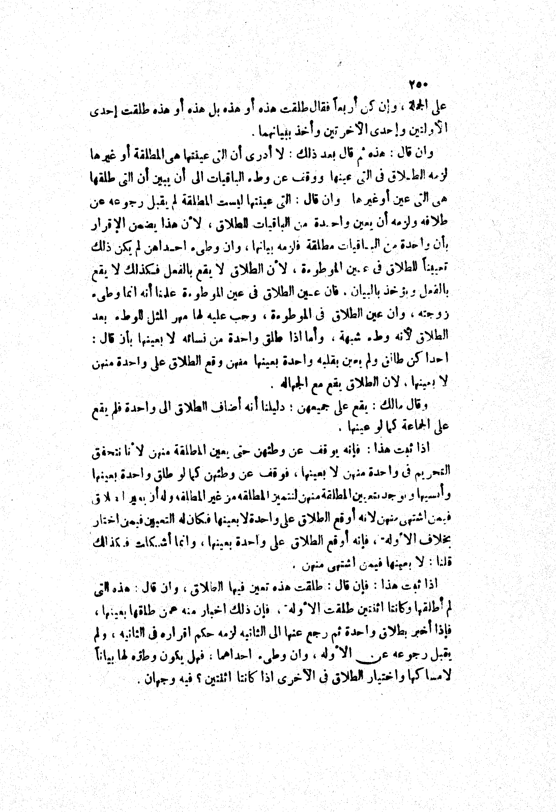إذا ثبت هذا: فإنه يوقف عن وطئهن حتى يعين المطلقة منهن لانا نتحفق التحريم في واحدة منهن لا بعينها، فوقف عن وطئهن كما لو طلق واحدة بعينها وأنسيها ويوجد تعيين المطلقة منهن لتتميز المطلقة من غير المطلقة وله أن يعين الطلاق فيمن اشتهى منهن لانه أوقع الطلاق على واحدة لا بعينها فكان له التعيين فيمن اختار بخلاف الاولة، فإنه أوقع الطلاق على واحدة بعينها، وانما أشكلت فكذلك قلنا: لا بعينها فيمن اشتهى منهن.