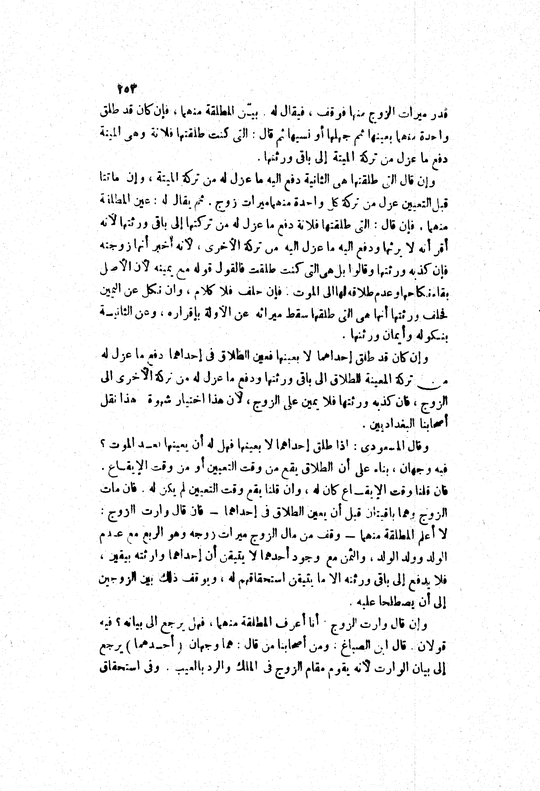 فان مات الزوج وهما باقيتان قبل أن يعين الطلاق في إحداهما - فان قال وارت الزوج: لا أعلم المطلقة منهما - وقف من مال الزوج ميرات زوجه وهو الربع مع عدم الولد وولد الولد، والثمن مع وجود أحدهما لا يتيقن أن إحداهما وارثته بيقين، فلا يدفع إلى باقى ورثته الا ما يتيقن استحقاقهم له، ويوقف ذلك بين الزوجين إلى أن يصطلحا عليه.