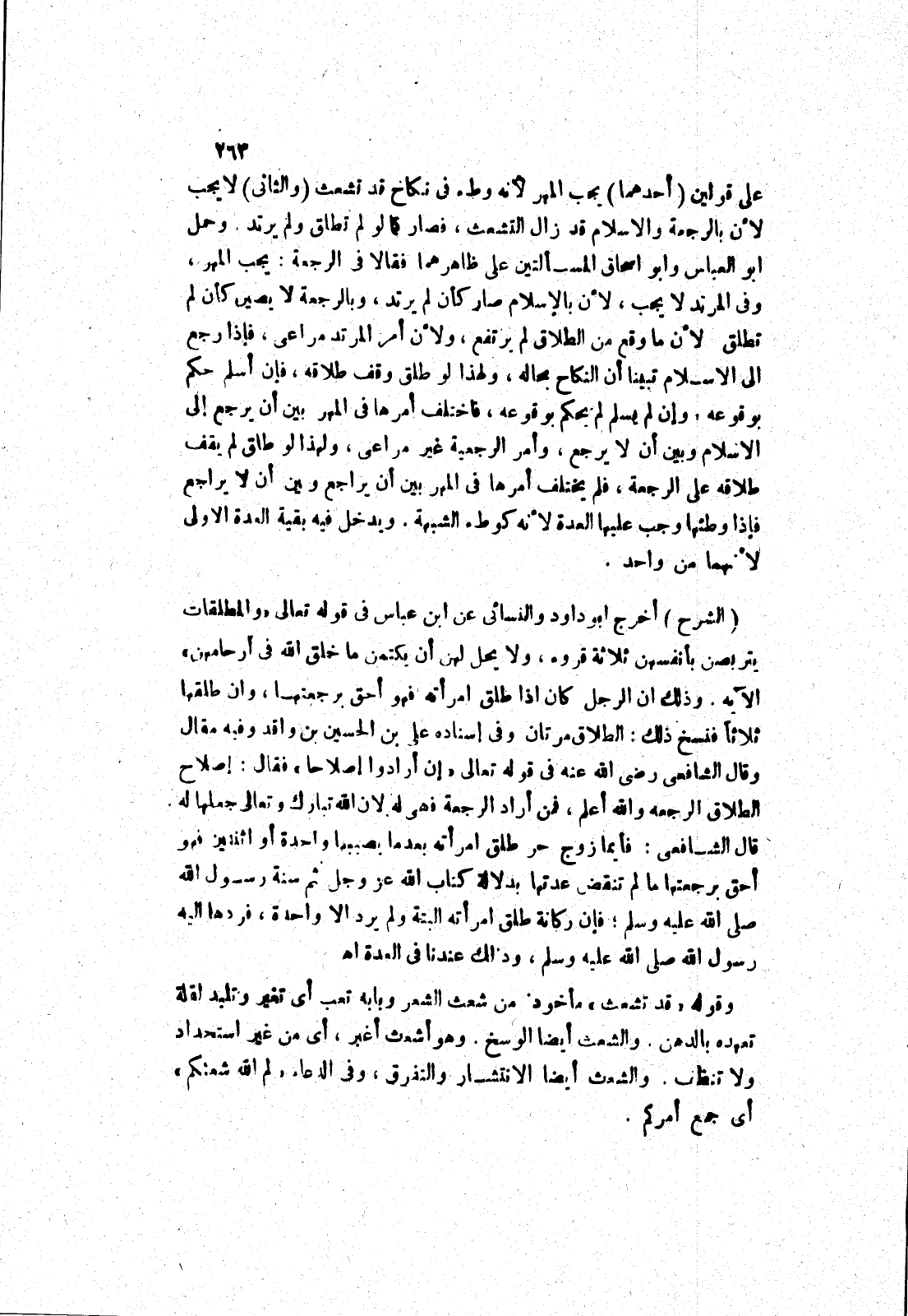 وذلك ان الرجل كان إذا طلق امرأته فهو أحق برجعتها، وان طلقها ثلاثا فنسخ ذلك: الطلاق مرتان وفى إسناده على بن الحسين بن واقد وفيه مقال وقال الشافعي رضى الله عنه في قوله تعالى " إن أرادوا إصلاحا " فقال: إصلاح الطلاق الرجعة والله أعلم، فمن أراد الرجعة فهى له لان الله تبارك وتعالى جعلها له قال الشافعي: فأيما زوج حر طلق امرأته بعدما يصيبها واحدة أو اثنتين فهو أحق برجعتها ما لم تنقض عدتها بدلالة كتاب الله عز وجل ثم سُنَّةِ رَسُولِ اللَّهِ صَلَّى اللَّهُ عَلَيْهِ وَسَلَّمَ: فَإِنْ ركانة طلق امرأته البتة ولم يرد الا واحدة، فردها إلَيْهِ رَسُولُ اللَّهِ صَلَّى اللَّهُ عَلَيْهِ وَسَلَّمَ، وذلك عندنا في العدة اه وقوله " قد تشعث " مأخوذ من شعث الشعر وبابه تعب أي تغير وتلبد لقلة تعهده بالدهن.