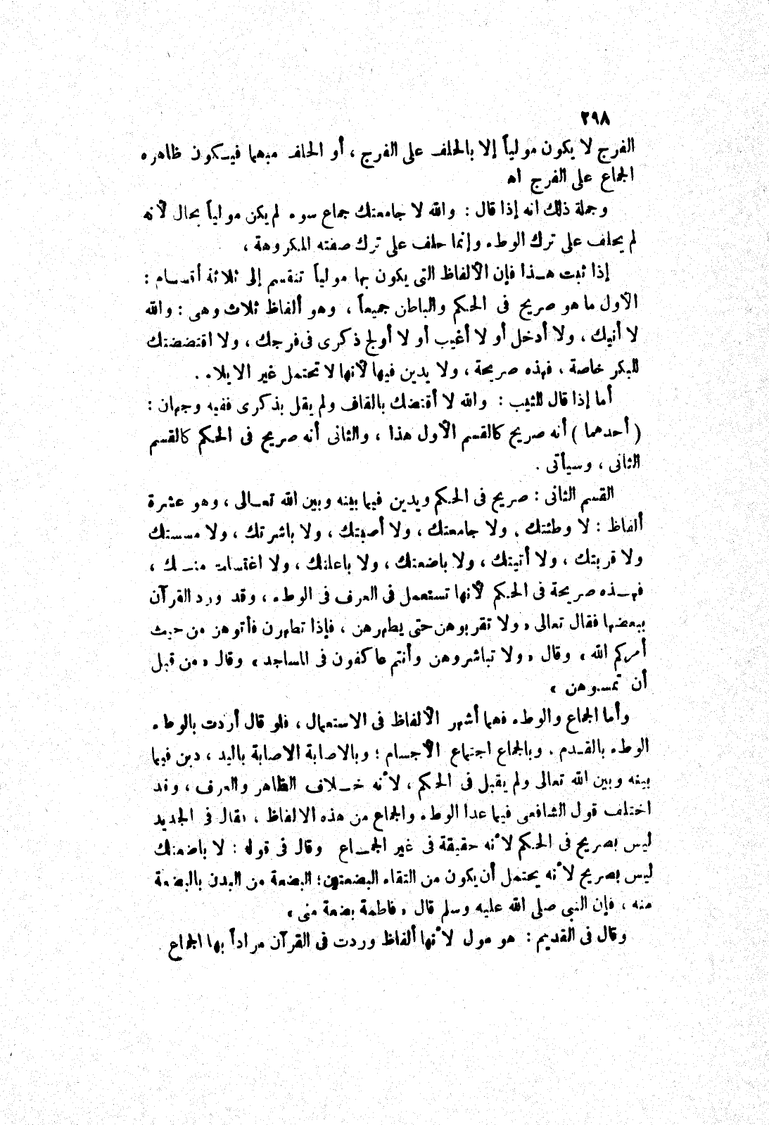القسم الثاني: صريح في الحكم ويدين فيما بينه وبين الله تعالى، وهو عشرة ألفاظ: لا وطئتك، ولا جامعتك، ولا أصبتك، ولا باشرتك، ولا مسستك ولا قربتك، ولا أتيتك، ولا باضعتك، ولا باعلنك، ولا اغتسلت منك، فهذه صريحة في الحكم لانها تستعمل في العرف في والوطئ، وقد ورد القرآن ببعضها فقال تعالى " ولا تقربوهن حتى يطهرهن، فَإِذَا تَطَهَّرْنَ فَأْتُوهُنَّ مِنْ حَيْثُ أَمَرَكُمُ اللَّهُ " وقال " ولا تباشروهن وأنتم عاكفون في المساجد " وقال " من قبل أن تمسوهن " وأما الجماع والوطئ فهما أشهر الالفاظ في الاستعمال، فلو قال أردت بالوطئ الوطئ بالقدم، وبالجماع أجتماع الاجسام، وبالاصابة الاصابة باليد، دين فيما