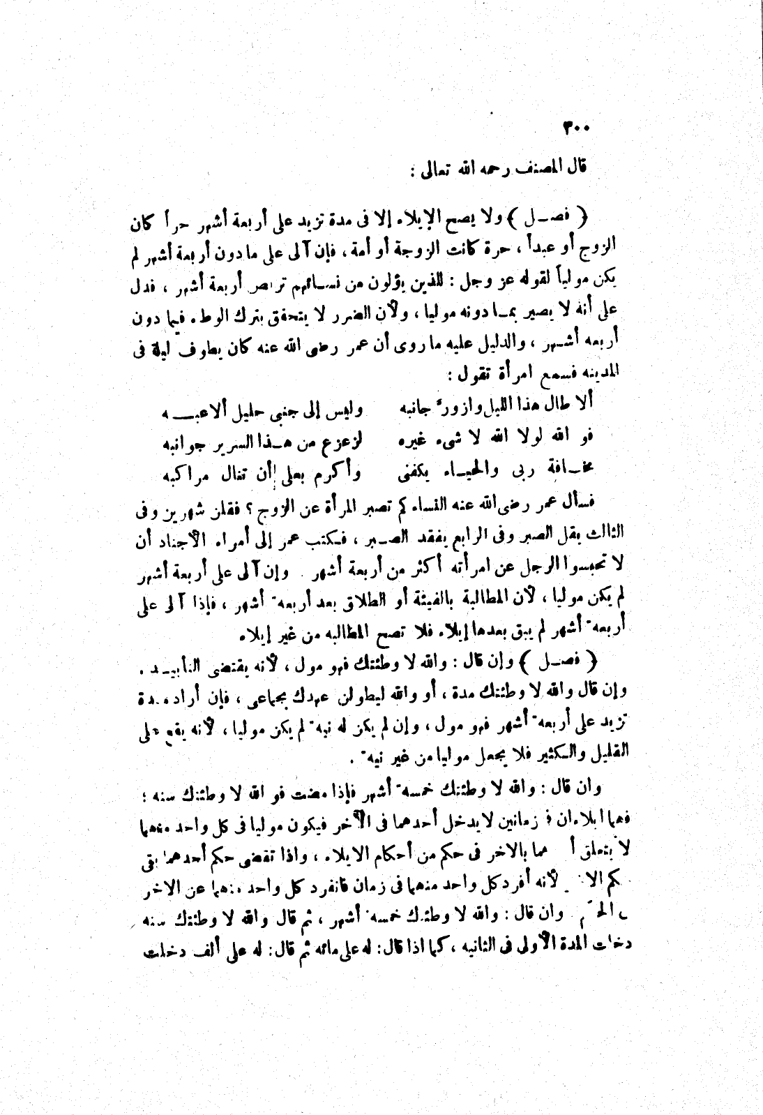 ولا يصح الايلاء إلا في مدة تزيد على أربعة أشهر حرا كان الزوج أو عبدا، حرة كانت الزوجة أو أمة، فإن آلى على ما دون أربعة أشهر لم يكن موليا لقوله عزوجل: للذين يؤلون من نسائهم تربص أربعة أشهر، فدل على أنه لا يصير بما دونه موليا، ولان الضرر لا يتحقق بترك الوطئ فيما دون أربعه أشهر، والدليل عليه ما روى أن عمر رضى الله عنه كان يطوف ليلة في المدينة فسمع امرأة تقول: ألا طال هذا الليل وازور جانبه