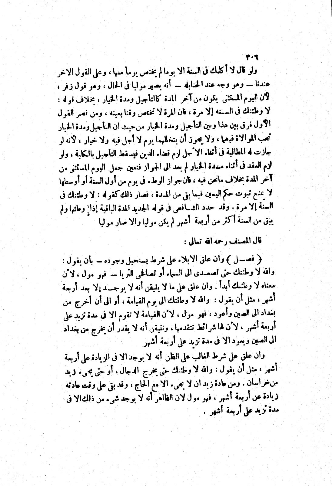 ولو قال لا أكلمك في السنة الا يوما لم يختص يوما منها، وعلى القول الاخر عندنا - وهو وجه عند الحنابلة - أنه يصير موليا في الحال، وهو قول زفر، لان اليوم المستثنى يكون من آخر المدة كالتأجيل ومدة الخيار، بخلاف قوله: لا وطئتك في السنة إلا مرة، فان المرة لا تختص وقتا بعينه، ومن نصر القول الاول فرق بين هذا وبين التأجيل ومدة الخيار من حيث ان التأجيل ومدة الخيار تجب الموالاة فيهما، ولا يجوز أن يتخللهما يوم لا أجل فيه ولا خيار، لانه لو جازت له المطالبة في أثناء الاجل لزم قضاء الدين فيسقط التأجل بالكلية، ولو لزم العقد في أثناء مدة الخيار لم يعد إلى الجواز فتعين جعل اليوم المستثنى من آخر المدة بخلاف ما نحن فيه، فان جواز الوطئ في يوم من أول السنة أو أوسطها لا يمنع ثبوت حكم اليمين فيما بقى من المدة، فصار كقوله: لا وطئتك في
