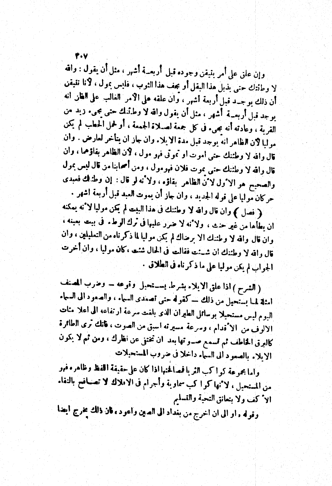 (الشرح) إذا علق الايلاء بشرط يستحيل وقوعه - وضرب المصنف امثلة لما يستحيل من ذلك - كقوله حتى تصعدى السماء، والصعود إلى السماء اليوم ليس مستحيلا بوسائل الطيران الذى بلغت سرعة ارتفاعه إلى اعلا مئات الالوف من الاقدام، وسرعة مسيرته اسبق من الصوت، فانك ترى الطائرة كالبرق الخاطف ثم تسمع صوتها بعد ان تختقى عن نظرك، ومن ثم لا يكون الايلاء بالصعود إلى السماء داخلا في ضروب المستحيلات واما مجموعة كواكب الثريا فمصافحتها إذا كان على حقيقة اللفظ وظاهره فهو من المستحيل، لانها كواكب سماوية وأجرام في الافلاك لا تصافح بالتقاء الاكف ولا بتعانق التحية والتسليم وقوله " أو إلى ان اخرج من بغداد إلى الصين واعود " فان ذلك يخرج ايضا