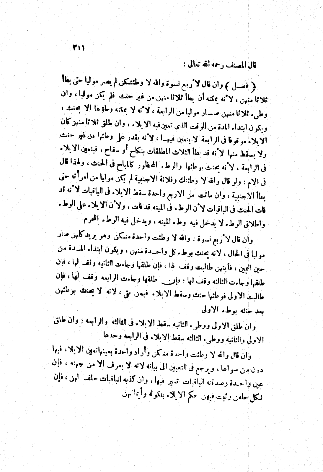 وان قال لاربع نسوة والله لا وطئتكن لم يصر موليا حتى يطأ ثلاثا منهن، لانه لا يمكنه أن يطأ ثلاثا منهن من غير حنث فلم يكن موليا، وان وطئ ثلاثا منهن صار موليا من الرابعة، لانه لا يمكنه وطؤها الا بحنث، ويكون ابتداء المدة من الوقت الذى تعين فيه الايلاء، وان طلق ثلاثا منهن كان الايلاء موقوفا في الرابعة لا يتعين فيها، لانه يقدر على وطئها من غير حنث ولا يسقط منها لانه قد يطأ الثلاث المطلقات بنكاح أو سفاح، فيتعين الايلاء في الرابعة، لانه يحنث بوطئها والوطئ المحظور كالمباح في الحنث، ولهذا قال في الام: ولو قال والله لا وطئتك وفلانة الاجنبية لم يكن موليا من امرأته حتى يطأ الاجنبية، وان ماتت من الاربع واحدة سقط الايلاء في الباقيات لانه قد