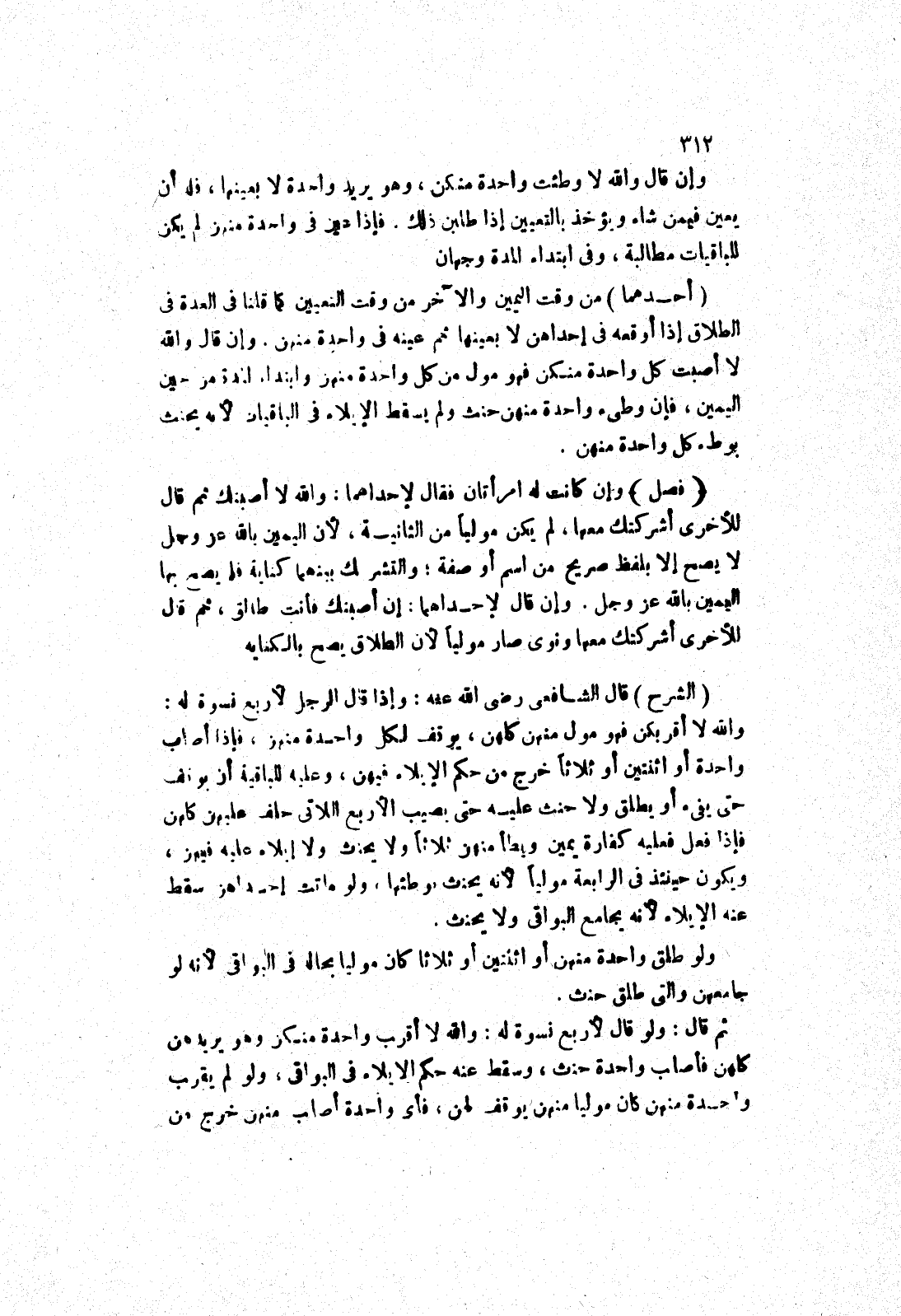 وإن قال لاحداهما: إن أصبتك فأنت طالق، ثم قال للاخرى أشركتك معها ونوى صار موليا لان الطلاق يصح بالكناية (الشرح) الشافعي رضى الله عنه: وإذا قال الرجل لاربع نسوة له: والله لا أقربكن فهو مول منهن كلهن، يوقف لكل واحدة منهن، فإذا أصاب واحدة أو اثنتين أو ثلاثا خرج من حكم الايلاء فيهن، وعليه للباقية أن يوقف حتى يفئ أو يطلق ولا حنث عليه حتى يصيب الاربع اللاتى حلف عليهن كلهن فإذا فعل فعليه كفارة يمين ويطأ منهن ثلاثا ولا يحنث ولا إيلاء عليه فيهن، ويكون حينئذ في الرابعة مولى لانه يحنث بوطئها، ولو ماتت إحداهن سقط عنه الايلاء لانه يجامع البواقى ولا يحنث.
