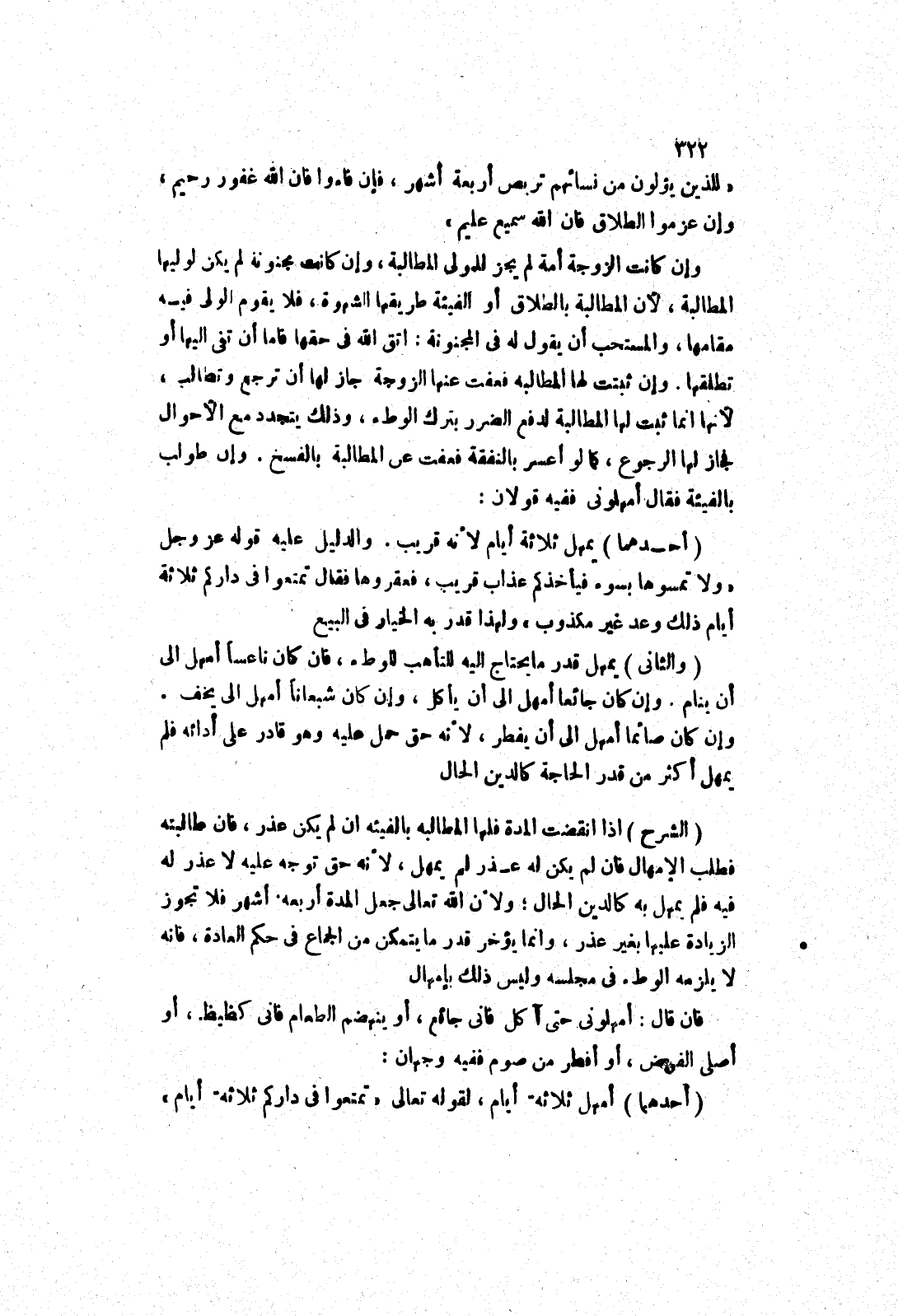 " للذين يؤلون من نسائهم تربص أربعة أشهر، فإن فاءوا فان الله غفور رحيم، وإن عزموا الطلاق فان الله سميع عليم " وإن كانت الزوجة أمة لم يجز للمولى المطالبة، وإن كانت مجنونة لم يكن لوليها المطالبة، لان المطالبة بالطلاق أو الفيئة طريقها الشهوة، فلا يقوم الولى فيه مقامها، والمستحب أن يقول له في المجنونة: اتق الله في حقها فاما أن تفى إليها أو تطلقها.