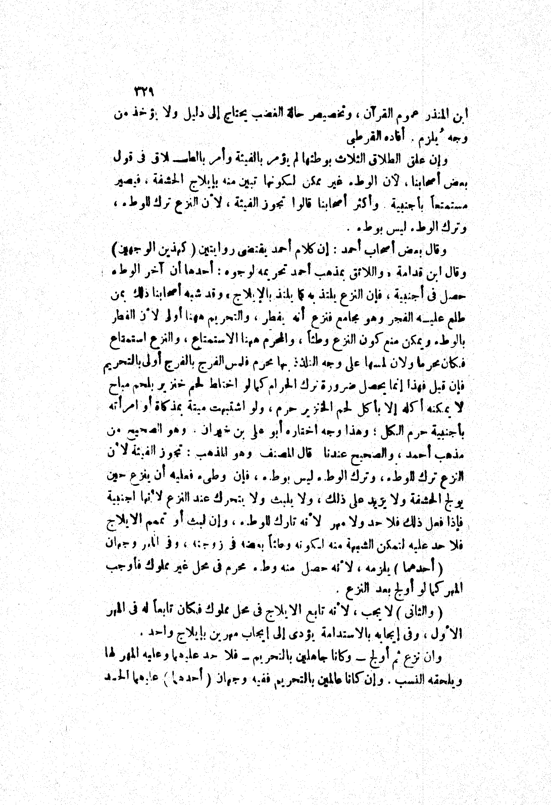 وقال بعض أصحاب أحمد: إن كلام أحمد يقتضى روايتين (كهذين الوجهين) وقال ابن قدامة " واللائق بمذهب أحمد تحريمه لوجوه: أحدها أن آخر الوطئ حصل في أجنبية، فإن النزع يلتذ به كما يلتذ بالايلاج، وقد شبه أصحابنا ذلك بمن طلع عليه الفجر وهو مجامع فنزع أنه يفطر، والتحريم ههنا أولى لان الفطر بالوطئ ويمكن منع كون النزع وطئا، والمحرم ههنا الاستمتاع، والنزع استمتاع فكان محرما ولان لمسها على وجه التلذذ بها محرم فليس الفرج بالفرج أولى بالتحريم فإن قيل فهذا إنما يحصل ضرورة ترك الحرام كما لو اختلط لحم خنزير بلحم مباح لا يمكنه أكله إلا بأكل لحم الخنزير حرم، ولو اشتبهت ميتة بمذكاة أو امرأته بأجنبية حرم الكل، وهذا وجه اختاره أبو على بن خيران.
