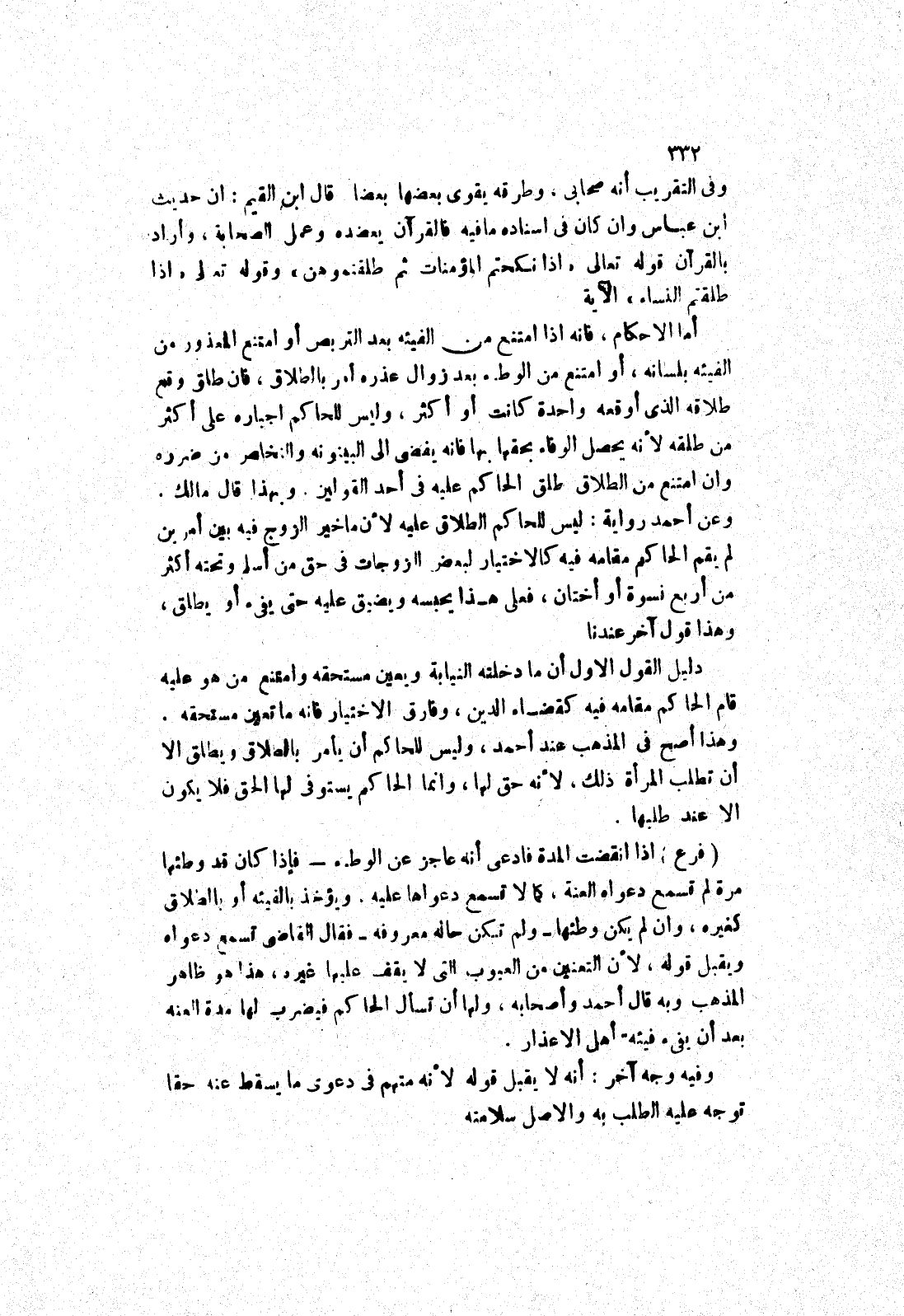 وفى التقريب أنه صحابي، وطرقه يقوى بعضها بعضا قال ابن القيم: ان حديث ابن عباس وان كان في اسناده ما فيه فالقرآن يعضده وعمل الصحابة، وأراد بالقرآن قوله تعالى " إذا نكحتم المؤمنات ثم طلقتموهن " وقوله تعالى " إذا طلقتم النساء " الآية أما الاحكام، فانه إذا امتنع من الفيئة بعد التربص أو امتنع المعذور من الفيئة بلسانه، أو امتنع من الوطئ بعد زوال عذره أمر بالطلاق، فان طلق وقع طلاقه الذى أوقعه واحدة كانت أو أكثر، وليس للحاكم اجباره على أكثر من طلقه لانه يحصل الوفاء بحقها بها فانه يفضى إلى البينونة والتخلص؟ من ضرره وان امتنع من الطلاق طلق الحاكم عليه في أحد القولين.