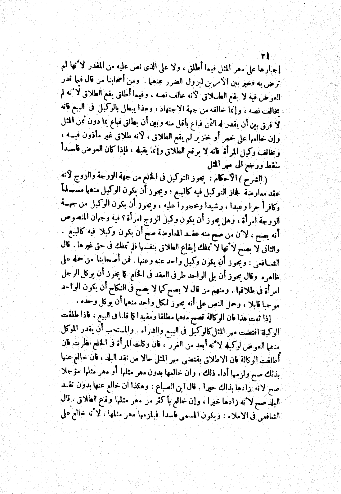 ومن أصحابنا من قال فيما قدر العوض فيه لا يقع الطلاق لانه خالف نصه، وفيما أطلق يقع الطلاق لانه لم يخالف نصه، وإنما خالفه من جهة الاجتهاد، وهذا يبطل بالوكيل في البيع فانه لا فرق بين أن يقدر له الثمن فباع بأقل منه وبين أن يطلق فباع بما دون ثمن المثل وإن خالعها على خمر أو خنزير لم يقع الطلاق، لانه طلاق غير مأذون فيه، ويخالف وكيل المرأة فانه لا يوقع الطلاق وإنما يقبله، فإذا كان العوض فاسدا سقط ورجع إلى مهر المثل (الشرح) الاحكام: يجوز التوكيل في الخلع من جهة الزوجة والزوج لانه عقد معاوضة فجاز التوكيل فيه كالبيع، ويجوز أن يكون الوكيل منهما مسلما وكافرا حرا وعبدا، رشيدا ومحجورا عليه، ويجوز أن يكون الوكيل من جهة الزوجة امرأة، وهل يجوز أن يكون وكيل الزوج امرأة؟ فيه وجهان المنصوص أنه يصح، لان من صح منه عقد المعاوضة صح أن يكون وكيلا فيه كالبيع.