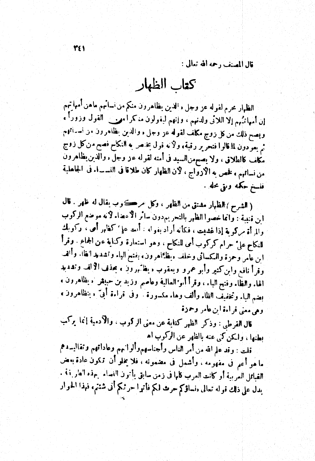 مكلف كالطلاق، ولا يصح من السيد في أمته لقوله عز وجل " والذين يظاهرون من نسائهم " فخص به الازواج، لان الظهار كان طلاقا في النساء في الجاهلية فنسخ حكمه وبقى محله (الشرح) الظهار مشتق من الظهر، وكل مركوب يقال له ظهر.