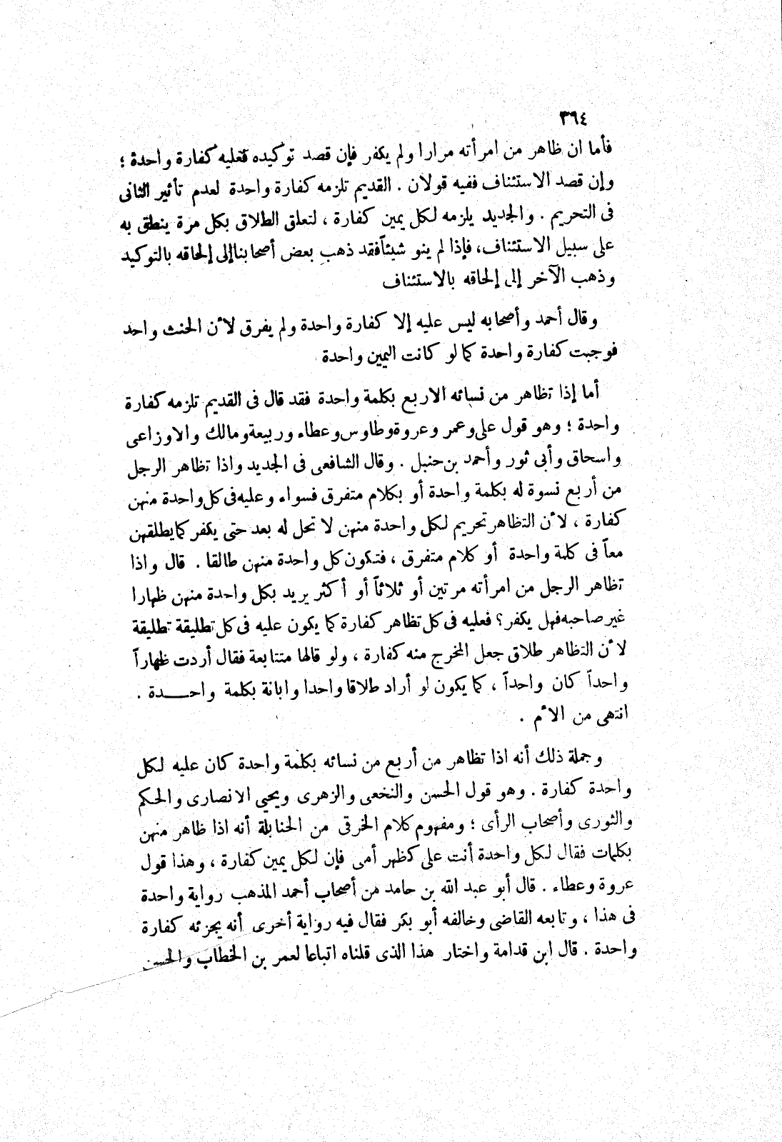 والجديد يلزمه لكل يمين كفارة، لتعلق الطلاق بكل مرة ينطق به على سبيل الاستئناف، فإذا لم ينو شيئا فقد ذهب بعض أصحابنا إلى إلحاقه بالتوكيد وذهب الآخر إلى إلحاقه بالاستئناف وقال أحمد وأصحابه ليس عليه إلا كفارة واحدة ولم يفرق لان الحنث واحد فوجبت كفارة واحدة كما لو كانت اليمين واحدة أما إذا تظاهر من نسائه الاربع بكلمة واحدة فقد قال في القديم تلزمه كفارة واحدة، وهو قول على وعمر وعروة وطاوس وعطاء وربيعة ومالك والاوزاعي واسحاق وأبى ثور وأحمد بن حنبل.
