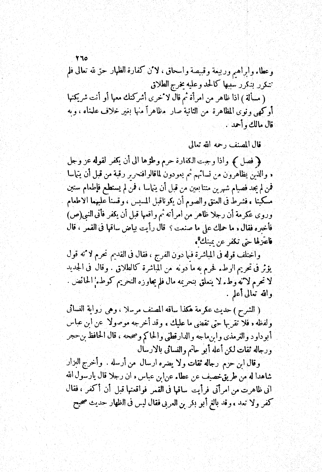 وإذا وجبت الكفارة حرم وطؤها إلى أن يكفر لقوله عز وجل " والذين يظاهرون من نسائهم ثم يعودون لما قالوا فتحرير رقبة من قبل أن يتماسا فمن لم يجد فصيام شهرين متتابيعن من قبل أن يتماسا، فمن لم يستطع فإطعام ستين مسكينا " فشرط في العتق والصوم أن يكونا قبل المسيس، وقسنا عليهما الاطعام وروى عكرمة أن رجلا ظاهر من امرأته ثم واقعها قبل أن يكفر فَأَتَى النَّبِيَّ صَلَّى اللَّهُ عَلَيْهِ وَسَلَّمَ فَأَخْبَرَهُ فقال " ما حملك على ما صنعت؟ قال رأيت بياض ساقها في القمر، قال فاعتزلها حتى تكفر عن يمينك "