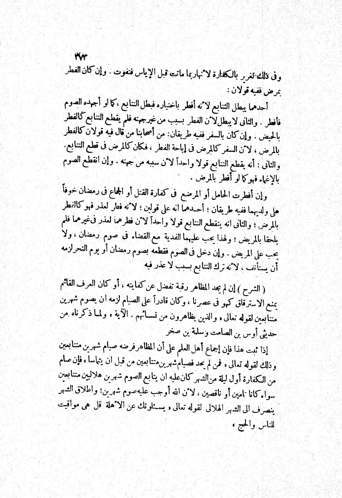 وإن دخل في الصوم فقطعه بصوم رمضان أو يوم النحر لزمه أن يستأنف، لانه ترك التتابع بسبب لا عذر فيه (الشرح) إن لم يجد المظاهر رقبة تفضل عن كفايته، أو كان العرف القائم يمنع الاسترقاق كهو في عصرنا، وكان قادرا على الصيام لزمه ان يصوم شهرين متتابعين لقوله تعالى " والذين يظاهرون من نسائهم. الآية " ولما ذكرناه من حديثى أوس بن الصامت وسلمة بن صخر إذا ثبت هذا فإن إجماع أهل العلم على أن المظاهرة فرضه صيام شهرين متتابعين وذلك لقوله تعالى " فمن لم يحد فصيام شهرين متتابعين من قبل ان يتماسا " فإن صام من الكفارة أول ليلة من الشهر كان عليه ان يتابع الصوم شهرين هلاليين متتابعين سواء كانا تامين أو ناقصين، لان الله أوجب عليه صوم شهرين، واطلاق الشهر ينصرف إلى الشهر الهلالي لقوله تعالى " يسئلونك عَنِ الأَهِلَّةِ قُلْ هِيَ مَوَاقِيتُ لِلنَّاسِ وَالْحَجِّ "