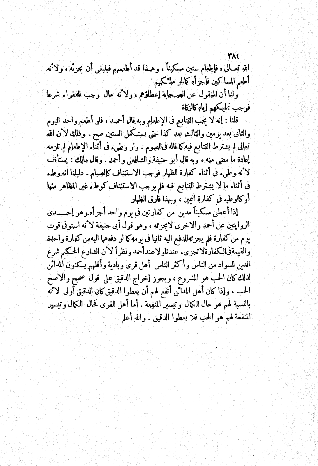 دليلنا انه وطئ في أثناء ما لا يشترط التتابع فيه فلم يوجب الاستئناف كوطئ غير المظاهر منها أو كالوطئ في كفارة اليمين، وبهذا فارق الظهار إذا أعطى مسكينا مدين من كفارتين في يوم واحد أجزأه وهو إحدى الروايتين عن أحمد والاخرى لا يجزئه، وهو قول أبى حنيفة لانه استوفى قوت يوم من كفارة فلم يجزئه الدفع إليه ثانيا في يومه كما لو دفعهما إليه من كفارة واحدة والقيمة في الكفارة لا تجزئ عندنا ولا عند أحمد ونظرا لان الشارع الحكيم شرع الدين للسواد من الناس وأكثر الناس أهل قرى وبادية وأقلهم يسكنون المدائن لذلك كان الحب هو المشروع، ويجوز إخراج الدقيق على قول صحيح والاصح الحب، وإذا كان أهل المدائن أنفع لهم أن يعطوا الدقيق كان الدقيق أولى لانه بالنسبة لهم هو حال الكمال وتيسير المنفعة.