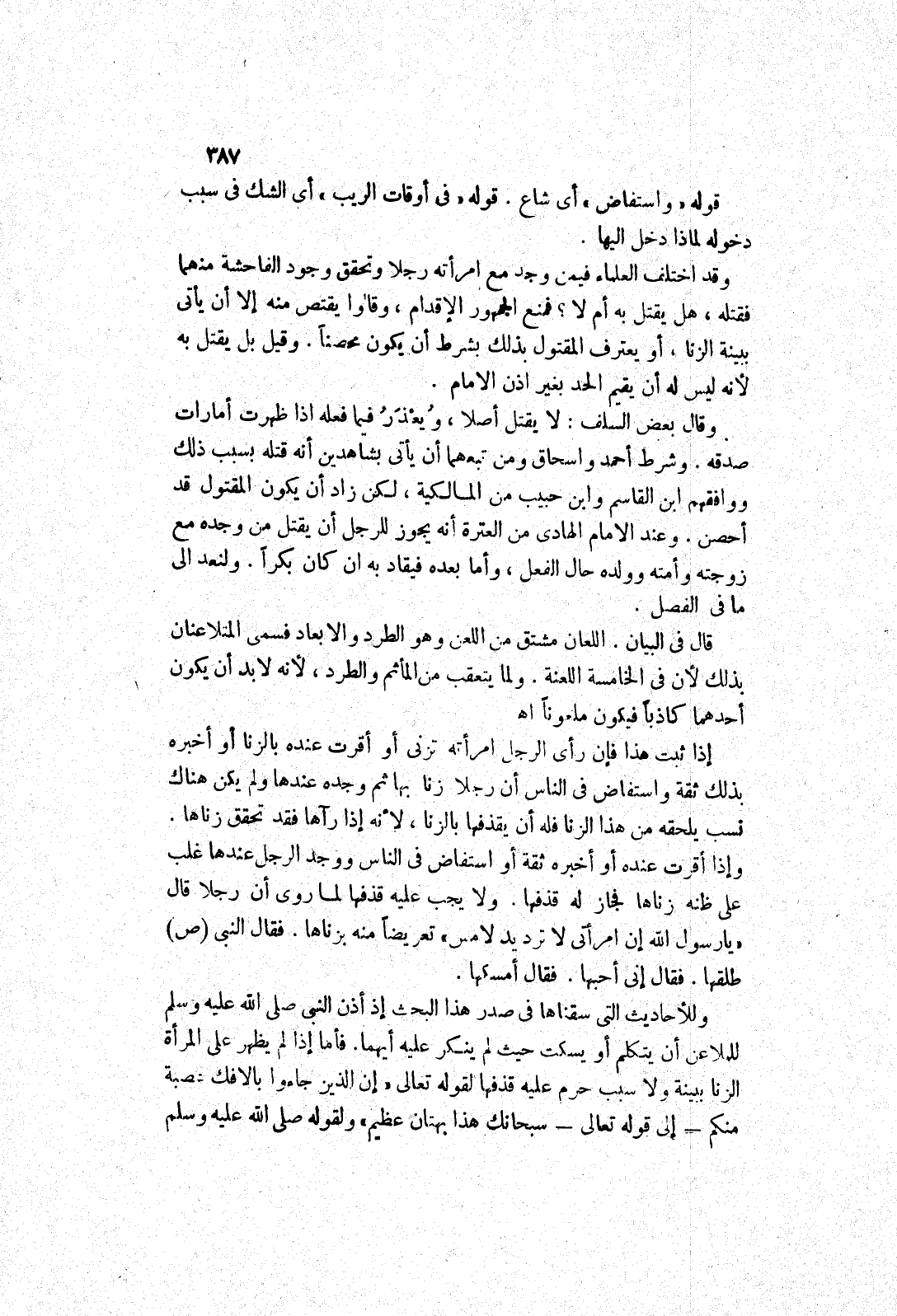 ولما يتعقب من المأثم والطرد، لانه لابد أن يكون أحدهما كاذبا فيكون ملعونا اه إذا ثبت هذا فإن رأى الرجل امرأته تزني أو أقرت عنده بالزنا أو أخبره بذلك ثقة واستفاض في الناس أن رجلا زنا بها ثم وجده عندها ولم يكن هناك نسب يلحقه من هذا الزنا فله أن يقذفها بالزنا، لانه إذا رآها فقد تحقق زناها.