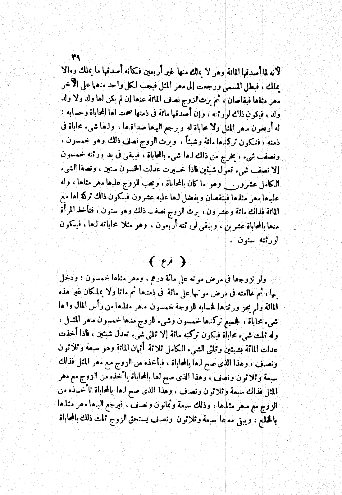 ولو تزوجها مرض موته على مائة درهم، ومهر مثلها خمسون، ودخل بها، ثم خالفته في مرض موتها على مائة في ذمتها ثم ماتا ولا يملكان غير هذه المائة ولم يجز ورثتها فحسابه للزوجة خمسون مهر مثلها من رأس المال ولها شئ محاباة، فجميع تركتها خمسون وشئ للزوج منها خمسون مهر المثل، وله ثلث شئ محاباة فيكون تركته مائة إلا ثلثى شئ تعدل شيئين، فإذا أخذت عدلت المائة بشيئين وثلثي الشئ الكامل ثلاثة أثمان المائة وهو سبعة وثلاثون ونصف، وهذا الذى صح لها بالمحاباة، فيأخذه من الزوج مع مهر المثل فذلك سبعة وثلاثون ونصف، وهذا الذى صح لها بالمحاباة يأخذه من الزوج مع مهر المثل فذلك سبعة وثلاثون ونصف، وهذا الذى صح لها بالمحاباة تأخذه من