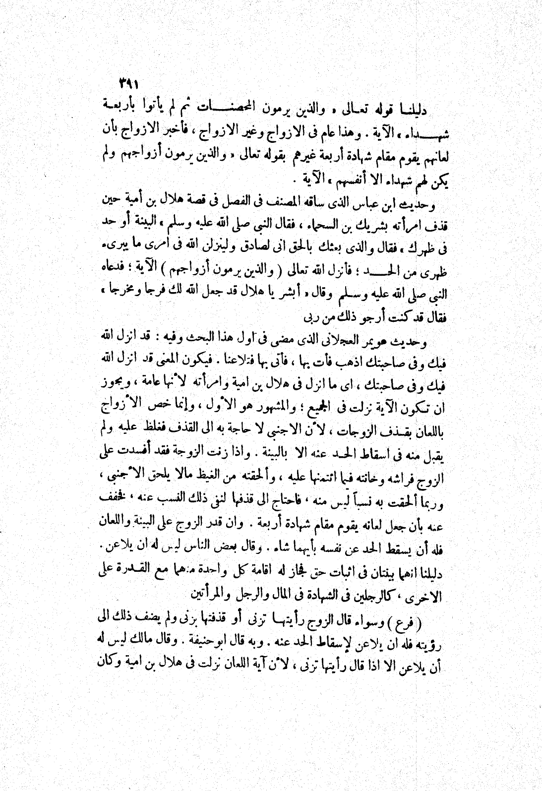 وحديث ابن عباس الذى ساقه المصنف في الفصل في قصة هلال بن أمية حين قذف امرأته بشريك بن السحماء، فقال النبي صلى الله عليه وسلم " البينة أو حد في ظهرك " فقال والذى بعثك بالحق انى لصادق ولينزلن الله في امرى ما يبرئ ظهرى من الحد، فأنزل الله تعالى (والذين يرمون أزواجهم) الآية، فدعاه النبي صلى الله عليه وسلم وقال " أبشر يا هلال قد جعل الله لك فرجا مخرجا " فقال قد كنت أرجو ذلك من ربى وحديث عويمر العجلاني الذى مضى في اول هذا البحث وفيه: قد انزل الله فيك وفى صاحبتك اذهب فأت بها، فأتى بها فتلاعنا.