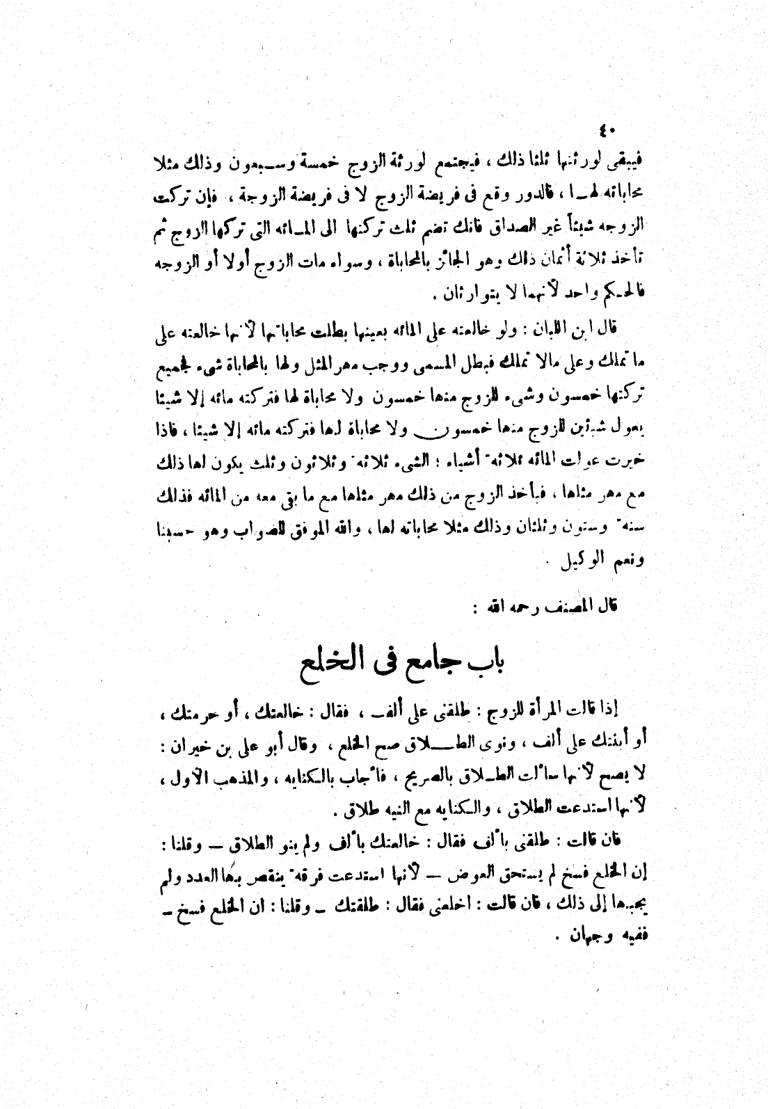 قال ابن اللبان: ولو خالعته على المائه بعينها بطلت محاباتها لانها خالعته على ما تملك وعلى مالا تملك فبطل المسمى ووجب مهر المثل ولها بالمحاباة شئ فجميع تركتها خمسون وشئ للزوج منها خمسون ولا محاباة لها فتركته مائه إلا شيئا يعول شيئين للزوج منها خمسون ولا محاباة لها فتركته مائه إلا شيئا، فإذا خيرت عولت المائه ثلاثة أشياء، الشئ ثلاثة وثلاثون وثلث يكون لها ذلك مع مهر مثلها، فيأخذ الزوج من ذلك مهر مثلها مع ما بقى معه من المائه فذلك سنة وستون وثلثان وذلك مثلا محاباته لها، والله الموفق للصواب وهو حسبنا ونعم الوكيل.