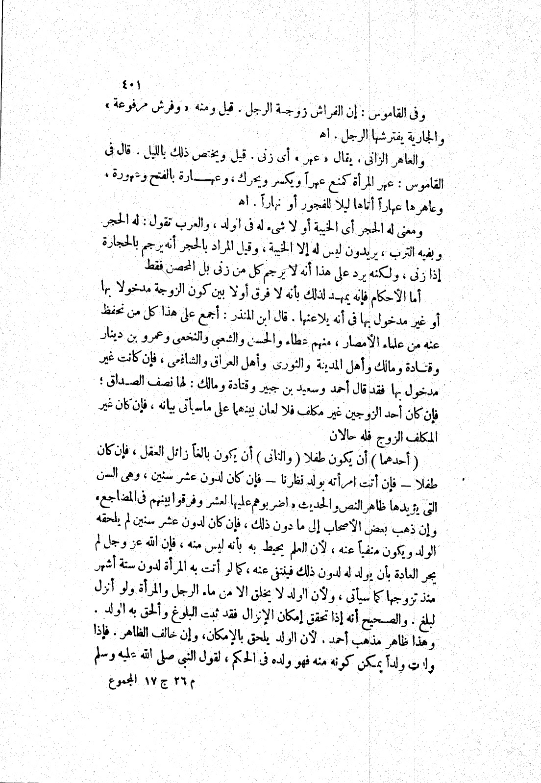 أن يكون بالغا زائل العقل، فإن كان طفلا - فإن أتت امرأته بولد نظرنا - فإن كان لدون عشر سنين، وهى السن التى يؤيدها ظاهر النص والحديث " اضربوهم عليها لعشر وفرقوا بينهم في المضاجع " وإن ذهب بعض الاصحاب إلى ما دون ذلك، فإن كان لدون عشر سنين لم يلحقه الولد ويكون منفيا عنه، لان العلم يحيط به بأنه ليس منه، فإن الله عز وجل لم يجر العادة بأن يولد له لدون ذلك فينتفى عنه، كما لو أتت به المرأة لدون ستة أشهر منذ تزوجها كما سيأتي، ولان الولد لا يخلق الا من ماء الرجل والمرأة ولو أنزل لبلغ.