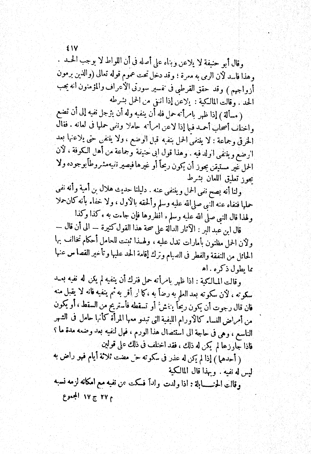 وقالت المالكية: يلاعن إذا انتفى من الحمل بشرطه (مسألة) إذا ظهر بامرأته حمل فله أن ينفيه وله أن يؤجل نفيه إلى أن تضع واختلف أصحاب أحمد فيما إذا لاعن امرأته حاملا ونفى حملها في لعان.