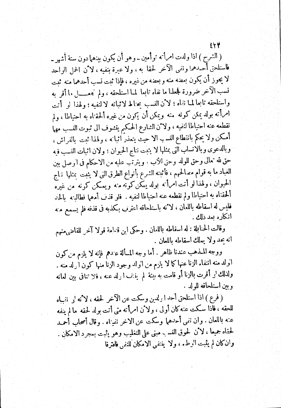 (الشرح) إذا ولدت امرأته توأمين - وهو أن يكون بينهما دون ستة أشهر - فاستلحق أحدهما ونفى الآخر لحقا به، ولا عبرة بنفيه، لان الحمل الواحد لا يجوز أن يكون بعضه منه وبعضه من غيره، فإذا ثبت نسب أحدهما منه ثبت نسب الآخر ضرورة فجعلنا ما نفاه تابعا لما استلحقه، ولم نجعل ما أقر به واستلحقه تابعا لما نفاه، لان النسب يحتاط لاثباته لا لنفيه، ولهذا لو أتت امرأته بولد يمكن كونه منه ويمكن أن يكون من غيره ألحقناه به احتياطا، ولم نقطعه عنه احتياطا لنفيه، ولان الشارع الحكيم يتشوف إلى ثبوت النسب مهما أمكن ولا يحكم بانقطاع النسب الا حيث يتعذر اثباته، ولهذا ثبت بالفراش،