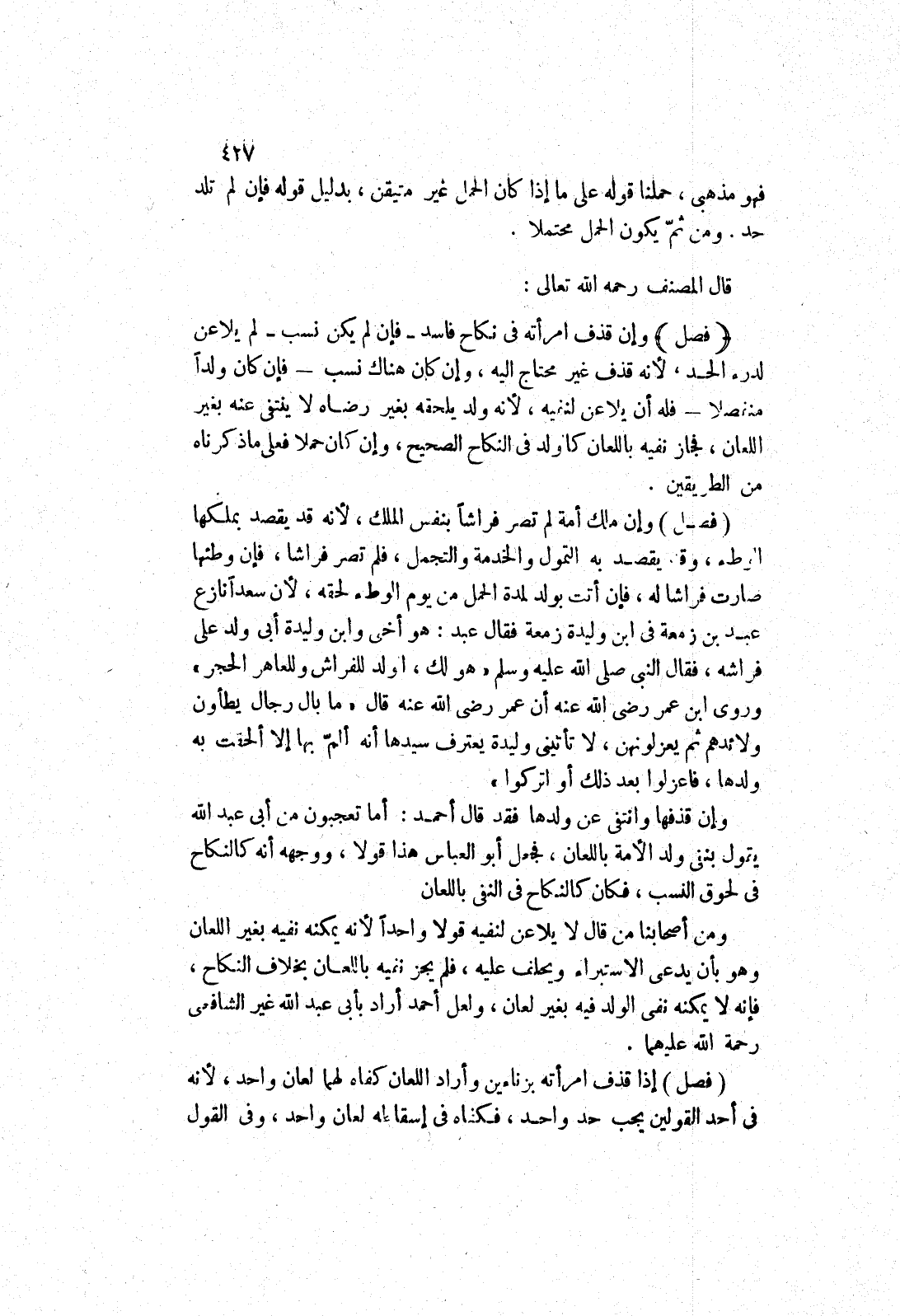 الوطئ، وقد يقصد به التمول والخدمة والتجمل، فلم تصر فراشا، فإن وطئها صارت فراشا له، فإن أتت بولد لمدة الحمل من يوم الوطئ لحقه، لان سعدا نازع عبد بن زمعة في ابن وليدة زمعة فقال عبد: هو أخى وابن وليدة أبى ولد على فراشه، فقال النبي صلى الله عليه وسلم " هو لك، الولد للفراش وللعاهر الحجر " وروى ابن عمر رضى الله عنه أن عمر رضى الله عنه قال " ما بال رجال يطأون ولائدهم ثم يعزلونهن، لا تأتيني وليدة يعترف سيدها أنه ألم بها إلا ألحقت به ولدها، فاعزلوا بعد ذلك أو اتركوا " وإن قذفها وانتفى عن ولدها فقد قال أحمد: أما تعجبون من أبى عبد الله يقول بنفى ولد الامة باللعان، فجعل أبو العباس هذا قولا، ووجهه أنه كالنكاح في لحوق النسب، فكان كالنكاح في النفى باللعان ومن أصحابنا من قال لا يلاعن لنفيه قولا واحدا لانه يمكنه نفيه بغير اللعان وهو بأن يدعى الاستبراء ويحلف عليه، فلم يجز نفيه باللعان بخلاف النكاح، فإنه لا يمكنه نفى الولد فيه بغير لعان، ولعل أحمد أراد بأبى عبد الله غير الشافعي رحمة الله عليهما.