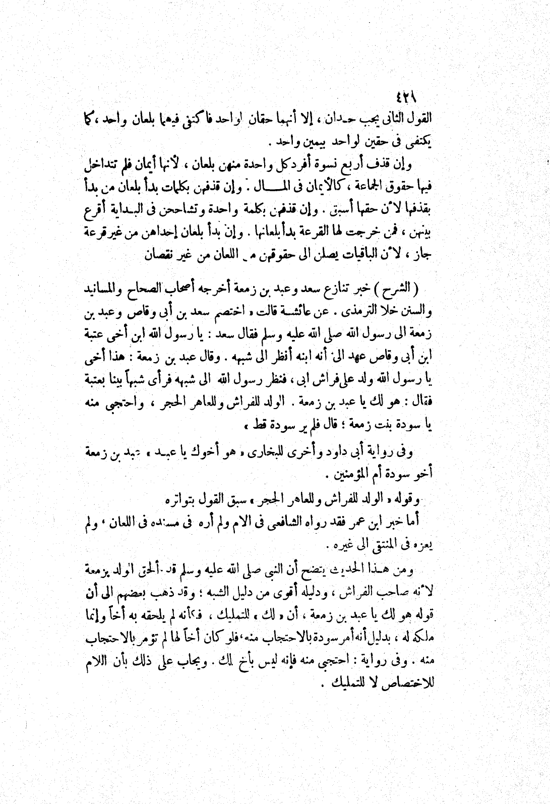 ومن هذا الحديث يتضح أَنَّ النَّبِيَّ صَلَّى اللَّهُ عَلَيْهِ وَسَلَّمَ قَدْ ألحق الولد بزمعة لانه صاحب الفراش، ودليله أقوى من دليل الشبه، وقد ذهب بعضهم إلى أن قوله هو لك يا عبد بن زمعة، أن " لك " للتمليك، فكأنه لم يلحقه به أخا وإنما ملكه له، بدليل أنه أمر سودة بالاحتجاب منه، فلو كان أخا لها لم تؤمر بالاحتجاب منه.