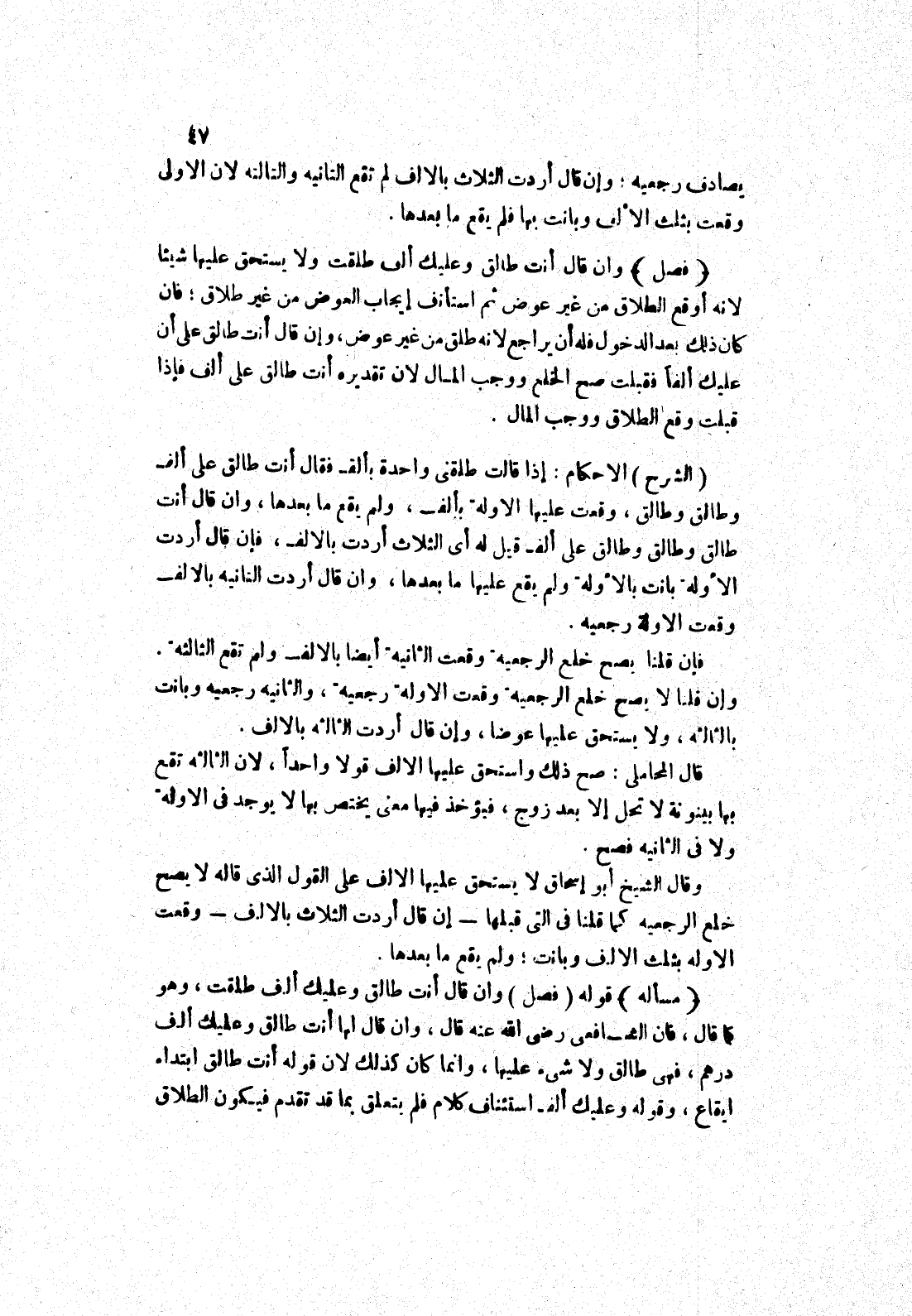 (الشرح) الاحكام: إذا قالت طلقني واحدة بألف فقال أنت طالق على ألف وطالق وطالق، وقعت عليها الاولة بألف، ولم يقع ما بعدها، وان قال أنت طالق وطالق وطالق على ألف قيل له أي الثلاث أردت بالالف، فإن قال أردت الاولة بانت بالاولة ولم يقع عليها ما بعدها، وان قال أردت الثانيه بالالف وقعت الاولة رجعيه.