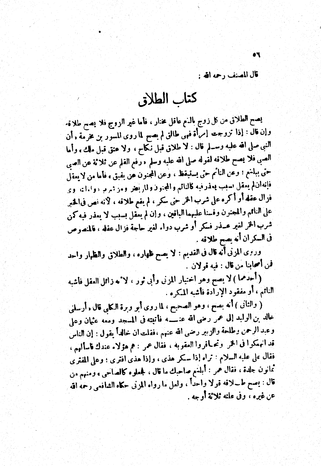 يصح الطلاق من كل زوج بالغ عاقل مختار، فأما غير الزوج فلا يصح طلاقه وإن قال: إذا تزوجت إمرأة فهى طالق لم يصح لما روى المسور بن مخرمة " إنَّ النَّبِيَّ صَلَّى اللَّهُ عَلَيْهِ وَسَلَّمَ قَالَ: لا طلاق قبل نكاح، ولا عتق قبل ملك " وأما الصبى فلا يصح طلاقه لقوله صَلَّى اللَّهُ عَلَيْهِ وَسَلَّمَ " رُفِعَ الْقَلَمُ عَنْ ثَلَاثَةٍ عَنْ الصَّبِيِّ حَتَّى يَبْلُغَ، وَعَنْ النَّائِمِ حَتَّى يَسْتَيْقِظَ، وَعَنْ الْمَجْنُونِ عن يفيق " فأما من لا يعقل فإنه ان لم يعقل بسبب يعذر فيه كالنائم والمجنون والمريض ومن شرب دواء؟ ؟ ؟ ؟ ؟ ؟ فزال عقله أو أكره على شرب الخمر حتى سكر، لم يقع طلاقه، لانه نص في الخبر على النائم والمجنون وقسنا عليهما الباقين، وان لم يعقل بسبب لا يعذر فيه كمن شرب الخمر لغير عذر فسكر أو شرب دواء لغير حاجة فزال عقله، فالمنصوص في السكران أنه يصح طلاقه.