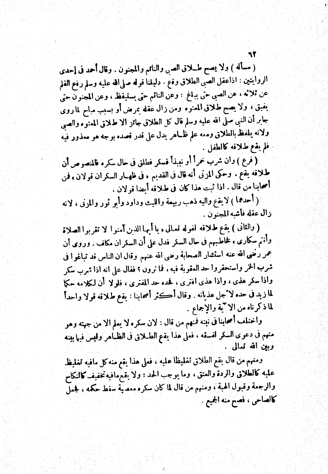 ومنهم من قال يقع الطلاق تغليظا عليه، فعلى هذا يقع منه كل ما فيه تغليظ عليه كالطلاق والردة والعتق، وما يوجب الحد، ولا يقع ما فيه تخفيف كالكناح والرجعة وقبول الهبة، ومنهم من قال لما كان سكره معصية سقط حكمه، فجعل كالصاحي، فصح منه الجميع.