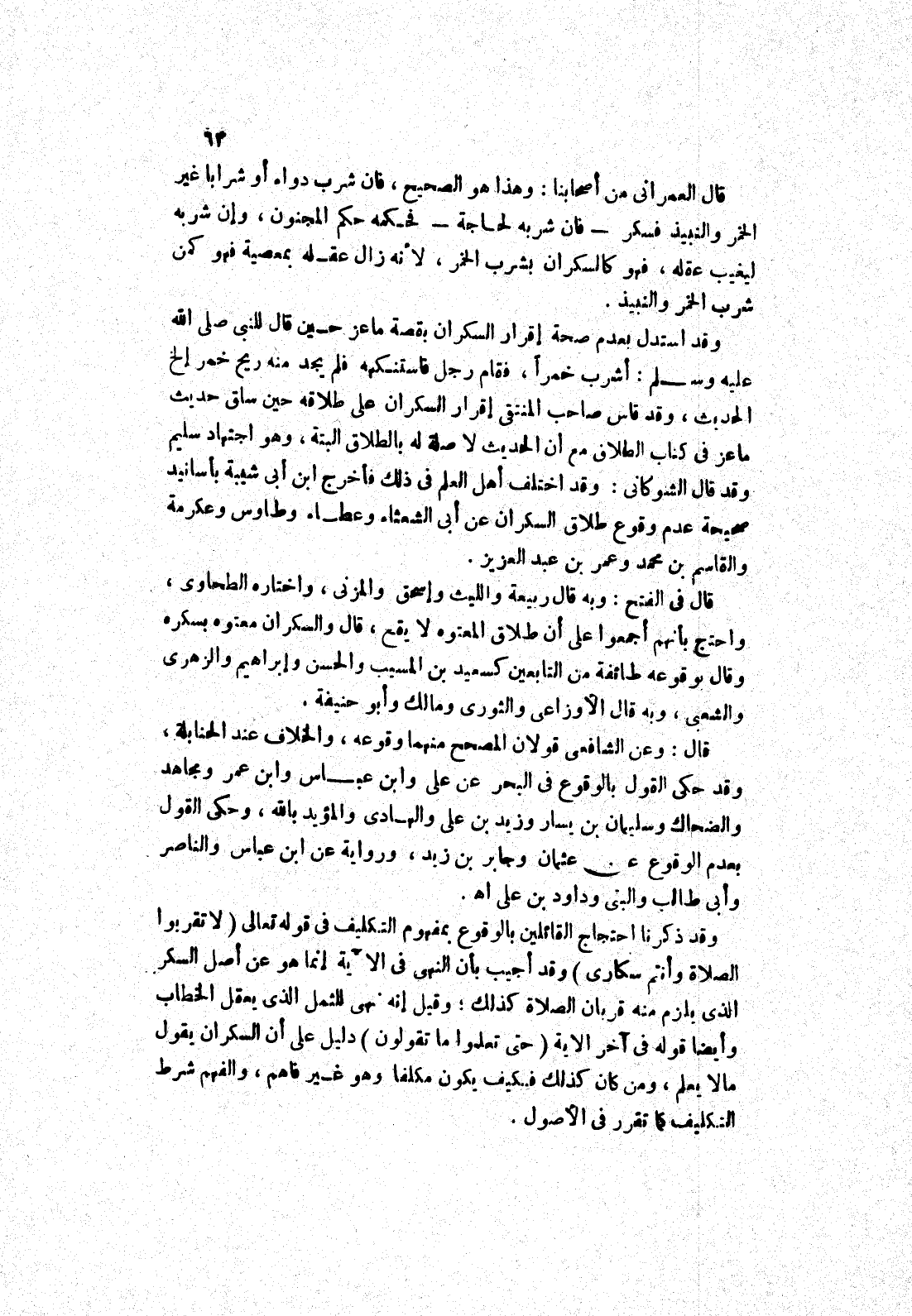 وقد ذكرنا احتجاج القائلين بالوقوع بمفهوم التكليف في قوله تعالى (لا تقربوا الصلاة وأنتم سكارى) وقد أجيب بأن النهى في الآية إنما هو عن أصل السكر الذى يلزم منه قربان الصلاة كذلك، وقيل إنه نهى للثمل الذى يعقل الخطاب وأيضا قوله في آخر الاية (حتى تعلموا ما تقولون) دليل على أن السكران يقول مالا يعلم، ومن كان كذلك فكيف يكون مكلفا وهو غير فاهم، والفهم شرط التكليف كما تقرر في الاصول.