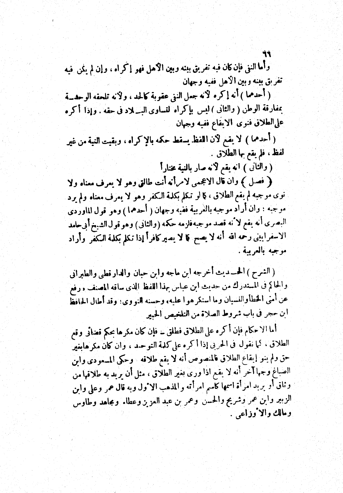(الشرح) الحديث أخرجه ابن ماجه وابن حبان والدارقطني والطبراني والحاكم في المستدرك من حديث ابن عباس بهذا اللفظ الذى ساقه المصنف " رُفِعَ عَنْ أُمَّتِي الْخَطَأُ وَالنِّسْيَانُ وَمَا اُسْتُكْرِهُوا عَلَيْهِ " وحسنه النووي، وقد أطال الحافظ ابن حجر في باب شروط الصلاة من التلخيص الحبير أما الاحكام فإن أكره على الطلاق فطلق - فإن كان مكرها بحكم قضائي وقع الطلاق، كما نقول في الحربى إذا أكره على كلمة التوحد، وان كان مكرها بغير حق ولم ينو إيقاع الطلاق فالمنصوص أنه لا يقع طلاقه.