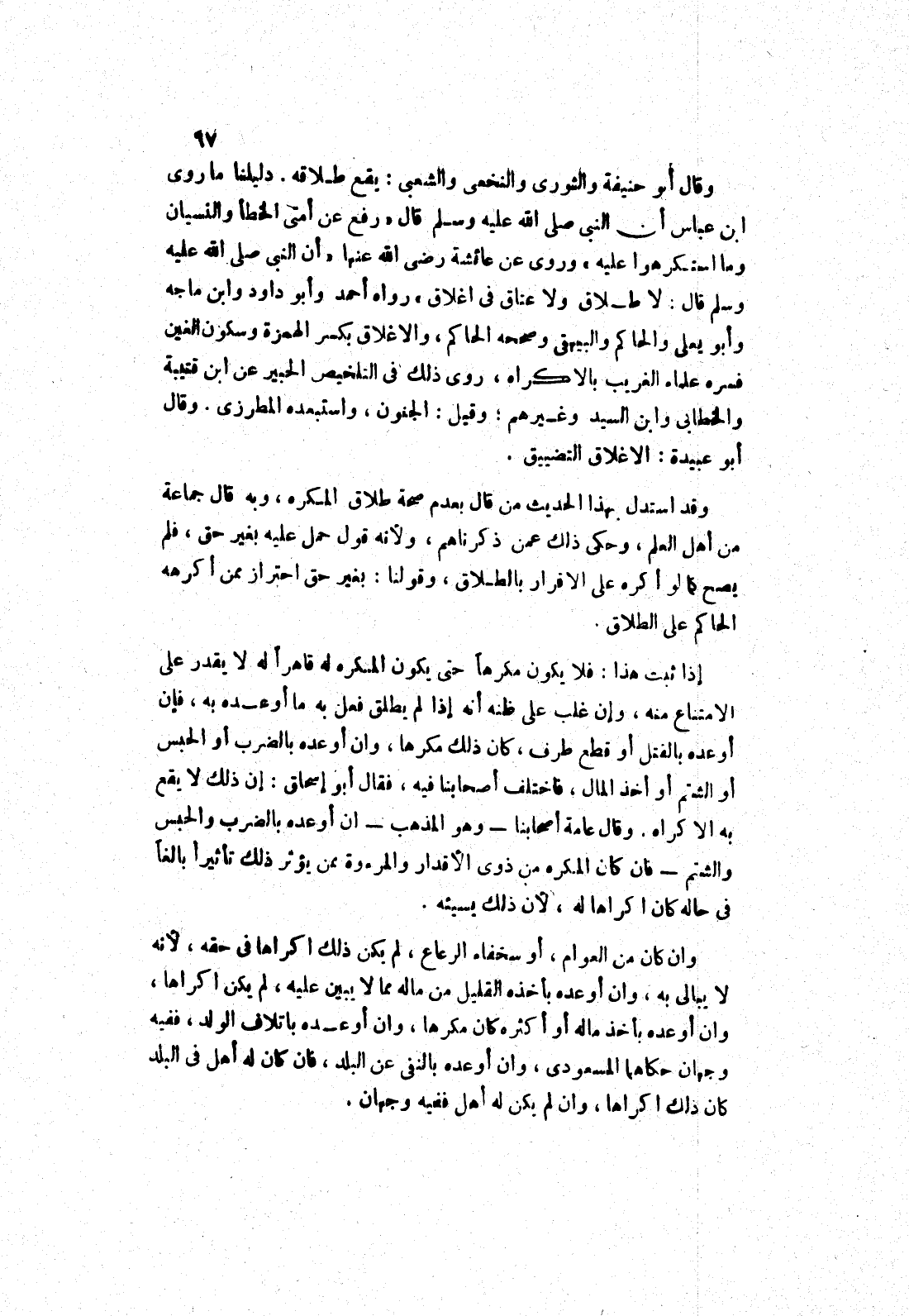 وقد استدل بهذا الحديث من قال بعدم صحة طلاق المكره، وبه قال جماعة ما أهل العلم، وحكى ذلك عمن ذكرناهم، ولانه قول حمل عليه بغير حق، فلم يصح كما لو أكره على الاقرار بالطلاق، وقولنا: بغير حق احتراز ممن أكرهه الحاكم على الطلاق.
