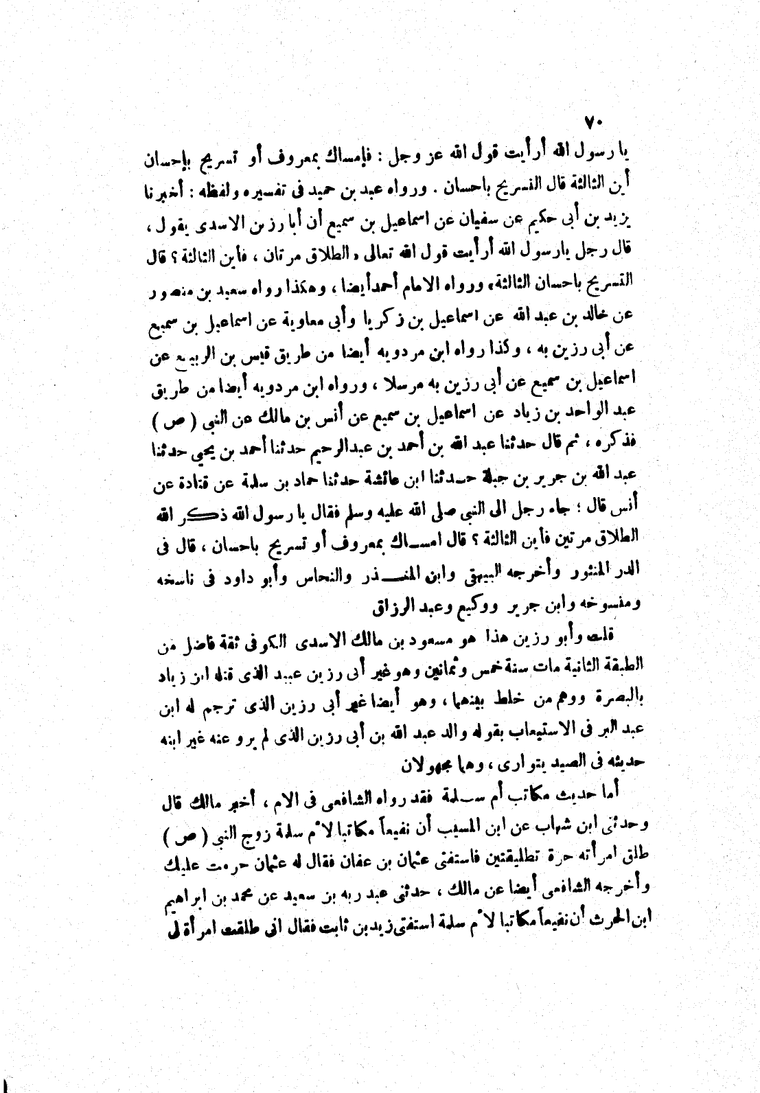 فذكره، ثم قال حدثنا عبد الله بن أحمد بن عبد الرحيم حدثنا أحمد بن يحيى حدثنا عبد الله بن جرير بن جبلة حدثنا ابن عائشة حدثنا حماد بن سلمة عن قتادة عن أَنَسٍ قَالَ، جَاءَ رَجُلٌ إلَى النَّبِيِّ صَلَّى اللَّهُ عَلَيْهِ وَسَلَّمَ فَقَالَ يَا رَسُولَ اللَّهِ ذكر الله الطلاق مرتين فأين الثالثة؟ قال امساك بمعروف أو تسريح باحسان، قال في الدر المنثور وأخرجه البيهقى وابن المنذر والنحاس وأبو داود في ناسخه ومنسوخه وابن جرير ووكيع وعبد الرزاق قلت وأبو رزين هذا هو مسعود بن مالك الاسدي الكوفى ثقة فاضل من الطبقة الثانية مات سنة خمس وثمانين وهو غير أبى رزين عبيد الذى قتله ابن زياد بالبصرة ووهم من خلط بينهما، وهو أيضا غير أبى رزين الذى ترجم له ابن عبد البر في الاستيعاب بقوله والد عبد الله بن أبى رزين الذى لم يرو عنه غير ابنه حديثه في الصيد يتوارى، وهما مجهولان أما حديث مكاتب أم سلمة فقد رواه الشافعي في الام، أخبر مالك قال وحدثني ابن شهاب عن ابن المسيب أن نفيعا مكاتبا لام سلمة زوج النبي صلى الله عليه وسلم طلق امرأته حرة تطليقتين فاستفتى عثمان بن عفان فقال له عثمان حرمت عليك وأخرجه الشافعي أيضا عن مالك، حدثنى عبد ربه بن سعيد عن محمد بن ابراهيم ابن الحرث أن نفيعا مكاتبا لام سلمة استفتى زيد بن ثابت فقال انى طلقت امرأة لى