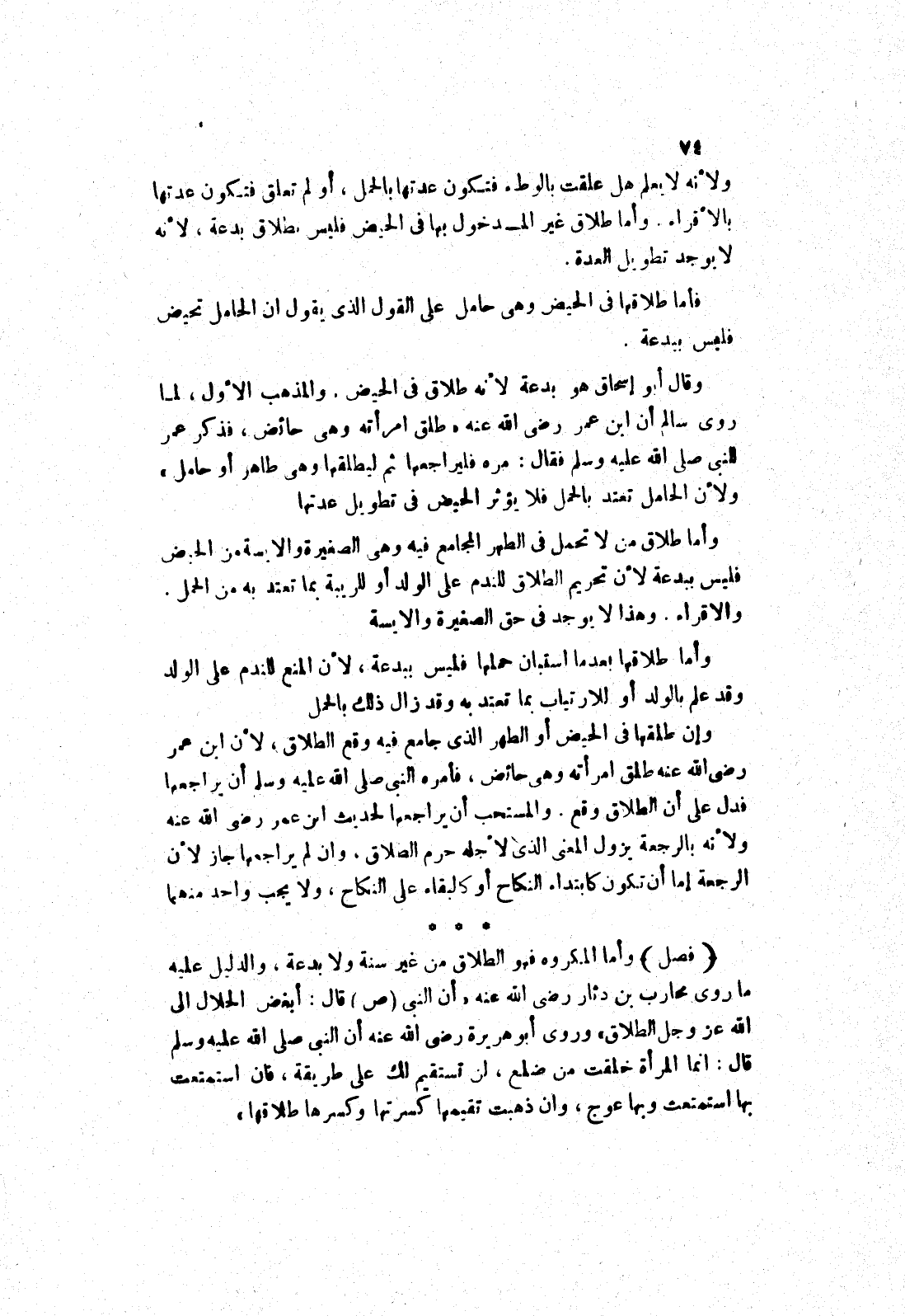 والمذهب الاول، لما روى سالم أن ابن عمر رضى الله عنه " طلق امرأته وهى حائض، فذكر عمر للنبى صلى الله عليه وسلم فقال: مره فليراجعها ثم ليطلقها وهى طاهر أو حامل " ولان الحامل تعتد بالحمل فلا يؤثر الحيض في تطويل عدتها وأما طلاق من لا تحمل في الطهر المجامع فيه وهى الصغيرة والايسة من الحيض فليس ببدعة لان تحريم الطلاق للندم على الولد أو للريبة بما تعتد به من الحمل.
