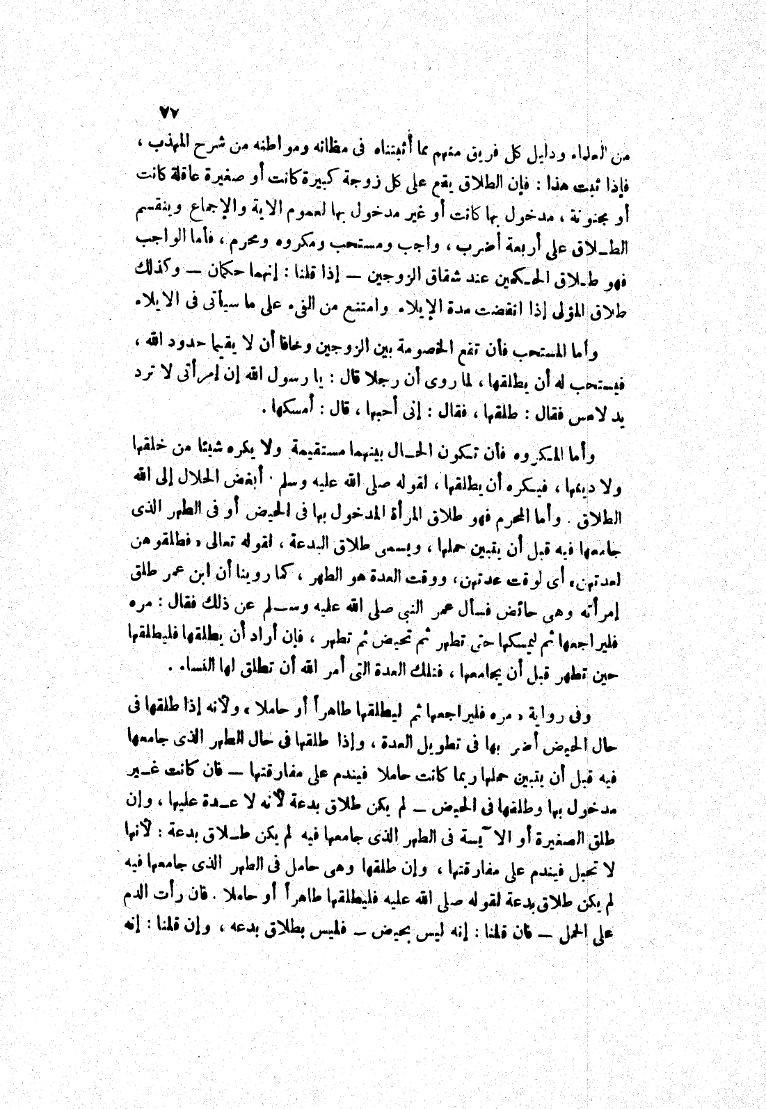 وأما المحرم فهو طلاق المرأة المدخول بها في الحيض أو في الطهر الذى جامعها فيه قبل أن يتبين حملها، ويسمى طلاق البدعة، لقوله تعالى " فطلقوهن لعدتهن " أي لوقت عدتهن، ووقت العدة هو الطهر، كما روينا أن ابن عمر طلق إمرأته وهى حائض فسأل عمر النَّبِيَّ صَلَّى اللَّهُ عَلَيْهِ وَسَلَّمَ عَنْ ذَلِكَ فقال: مره فليراجعها ثم ليمسكها حتى تطهر ثم تحيض ثم تطهر، فإن أراد أن يطلقها فليطلقها حين تطهر قبل أن يجامعها، فتلك العدة التى أمر الله أن تطلق لها النساء.