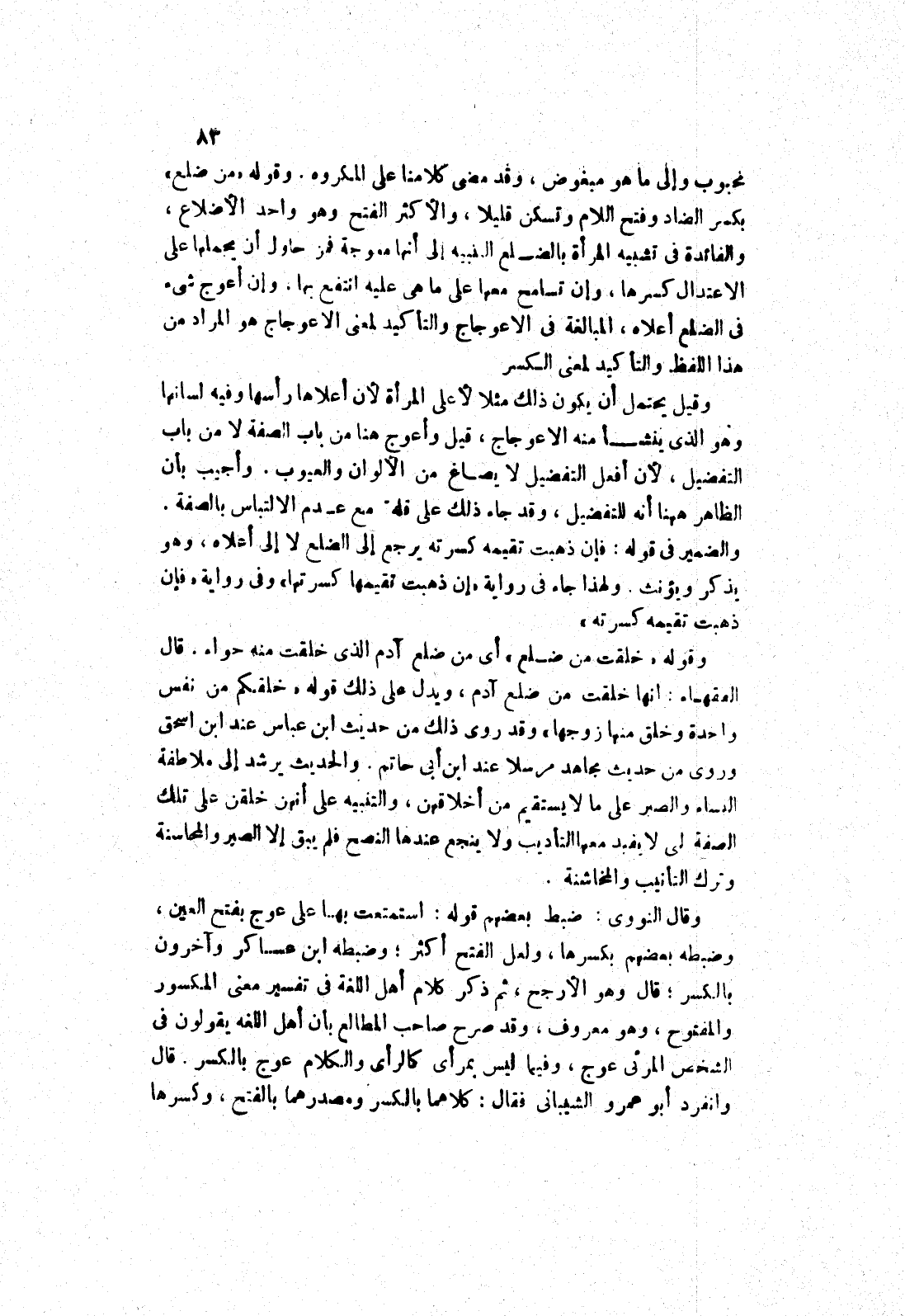 وقوله " من ضلع " بكسر الضاد وفتح اللام وتسكن قليلا، والاكثر الفتح وهو واحد الاضلاع، والفائدة في تشبيه المرأة بالضلع التنبيه إلى أنها معوجة فمن حاول أن يحملها على الاعتدال كسرها، وإن تسامح معها على ما هي عليه انتفع بها، وإن أعوج شئ في الضلع أعلاه، المبالغة في الاعوجاج والتأكيد لمعنى الاعوجاج هو المراد من هذا اللفظ والتأكيد لمعنى الكسر وقيل يحتمل أن يكون ذلك مثلا لاعلى المرأة لان أعلاها رأسها وفيه لسانها وهو الذى ينشأ منه الاعوجاج، قيل وأعوج هنا من باب الصفة لا من باب التفضيل، لان أفعل التفضيل لا يصاغ من الالوان والعيوب.