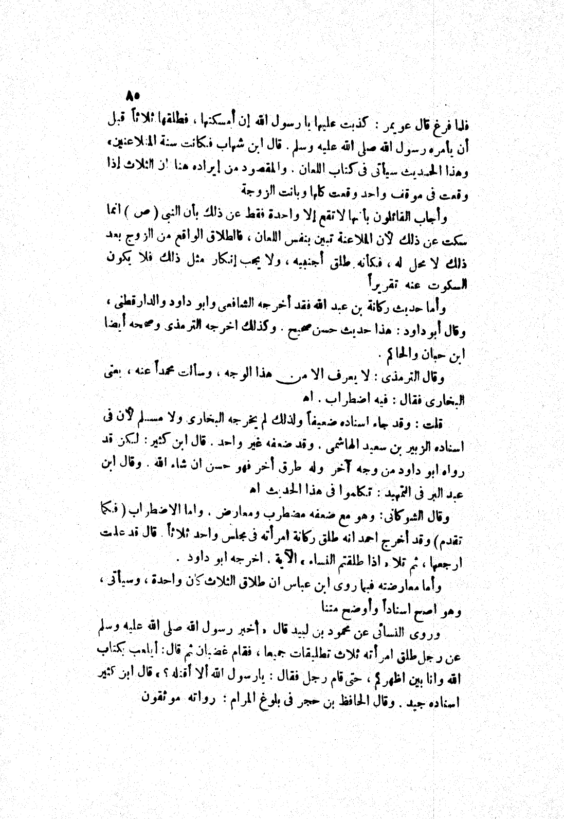 وأما معارضته فيما روى ابن عباس ان طلاق الثلاث كان واحدة، وسيأتى، وهو اصح اسنادا وأوضح متنا وروى النسائي عن محمود بن لبيد قال " أخبر رَسُولُ اللَّهِ صَلَّى اللَّهُ عَلَيْهِ وَسَلَّمَ عَنْ رجل طلق امرأته ثلاث تطليقات جميعا، فقام غضبان ثم قال: أيلعب بكتاب الله وانا بين اظهركم، حتى قام رجل فقال: يا رسول الله ألا أقتله؟ " قال ابن كثير اسناده جيد.