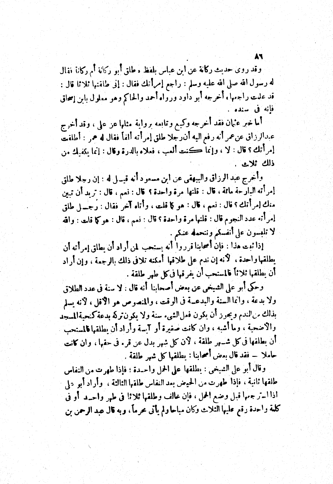 وأخرج عبد الرزاق البيهقى عن ابن مسعود أنه قيل له: إن رجلا طلق إمرأته البارحة مائة، قال: قلتها مرة واحدة؟ قال: نعم، قال: تريد أن تبين منك إمرأتك؟ قال: نعم، قال: هو كما قلت، وأتاه آخر فقال: رجل طلق إمرأته عدد النجوم قال: قلتها مرة واحدة؟ قال: نعم، قال: هو كما قلت: والله لا تلبسون على أنفسكم ونتحمله عنكم إذا ثبت هذا: فإن أصحابنا قرروا أنه يستحب لمن أراد أن يطلق إمرأته أن يطلقها واحدة، لانه إن ندم على طلاقها أمكنه تلافى ذلك بالرجعة، وإن أراد أن يطلقها ثلاثا فالمستحب أن يفرقها في كل طهر طلقة.