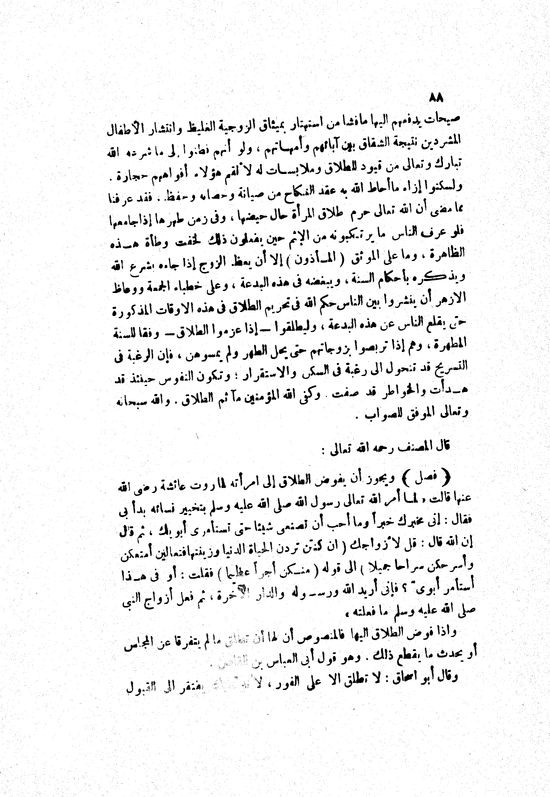ولسكتوا إزاء ما أحاط الله به عقد النكاح من صيانة وحصانه وحفظ، فقد عرفنا مما مضى أن الله تعالى حرم طلاق المرأة حال حيضها، وفى زمن طهرها إذا جامعها فلو عرف الناس ما يرتكبونه من الاثم حين يفعلون ذلك لخفت وطأة هذه الظاهرة، وما على الموثق (المأذون) إلا أن يعظ الزوج إذا جاءه بشرع الله ويذكره بأحكام السنة، ويبغضه في هذه البدعة، وعلى خطباء الجمعة ووعاظ الازهر أن ينشروا بين الناس حكم الله في تحريم الطلاق في هذه الاوقات المذكورة حتى يقلع الناس عن هذه البدعة، وليطلقوا - إذا عزموا الطلاق - وفقا للسنة المطهرة، وهم إذا تربصوا بزوجاتهم حتى يحل الطهر ولم يمسوهن، فإن الرغبة في التسريح قد تتحول إلى رغبة في السكن والاستقرار، وتكون النفوس حينئذ قد هدأت والخواطر قد صفت.