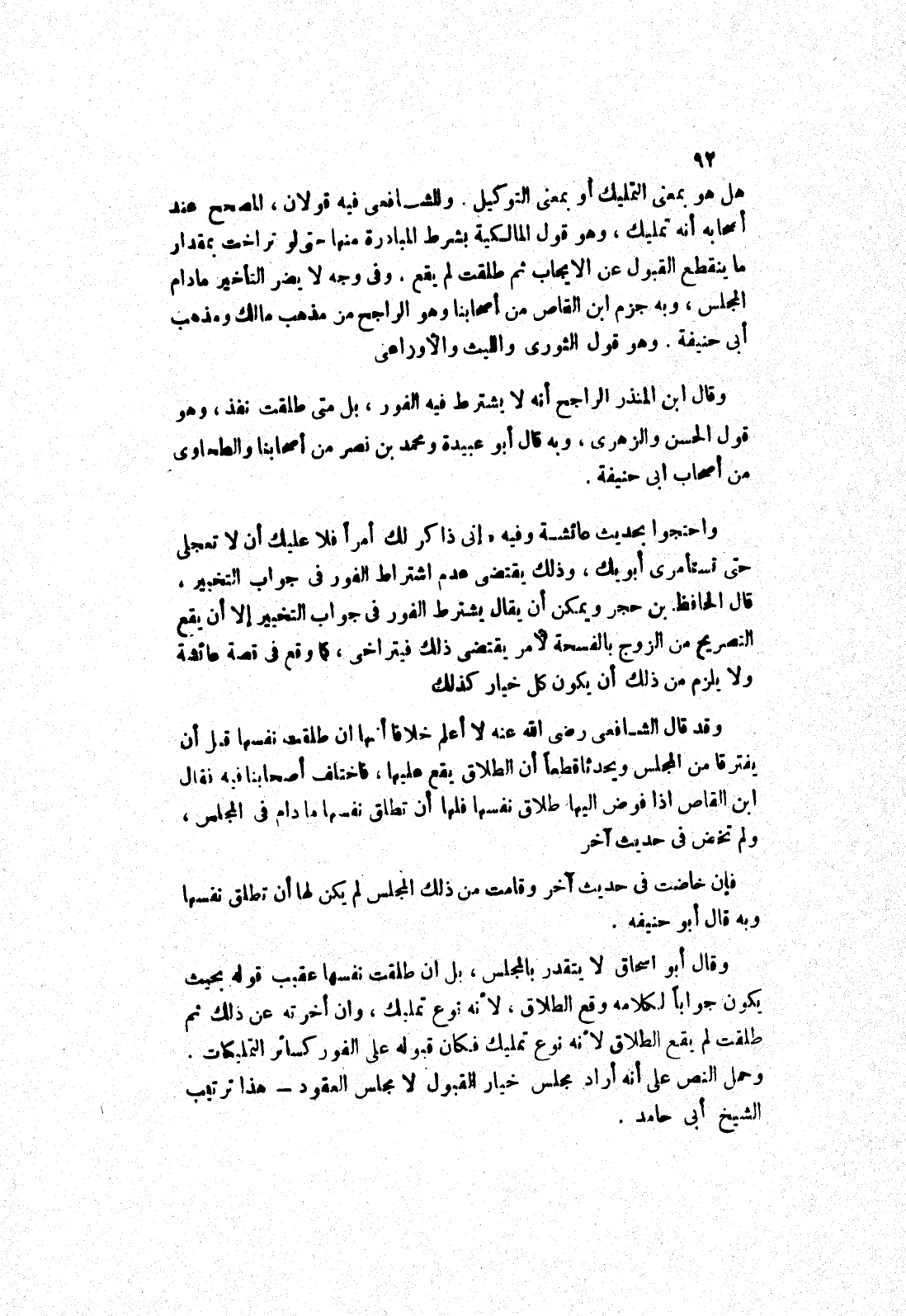 واحتجوا بحديث عائشة وفيه " إنى ذاكر لك أمرا فلا عليك أن لا تعجلى حتى تستأمرى أبويك، وذلك يقتضى عدم اشتراط الفور في جواب التخيير، قال الحافظ بن حجر ويمكن أن يقال يشترط الفور في جواب التخيير إلا أن يقع التصريح من الزوج بالفسحة لامر يقتضى ذلك فيتراخى، كما وقع في قصة عائشة ولا يلزم ذلك أن يكون كل خيار كذلك وقد قال الشافعي رضى الله عنه لا أعلم خلافا أنها ان طلقت نفسها قبل أن يفترقا من المجلس ويحدثا قطعا أن الطلاق يقع عليها، فاختلف أصحابنا فيه فقال ابن القاص إذا فوض إليها طلاق نفسها فلها أن تطلق نفسها مادام في المجلس، ولم تخض في حديث آخر فإن خاضت في حديث آخر وقامت من ذلك المجلس لم يكن لها أن تطلق نفسها وبه قال أبو حنيفة.