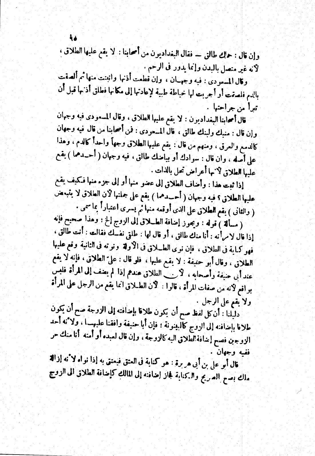 قال أصحابنا البغداديون: لا يقع عليها الطلاق، وقال المسعودي فيه وجهان وإن قال: منيك ولبنك طالق، قال المسعودي: فمن أصحابنا من قال فيه وجهان كالدمع والعرق، ومنهم من قال: يقع عليها الطلاق وجها واحدا كالدم، وهذا على أصله، وان قال: سوادك أو بياضك طالق، فيه وجهان