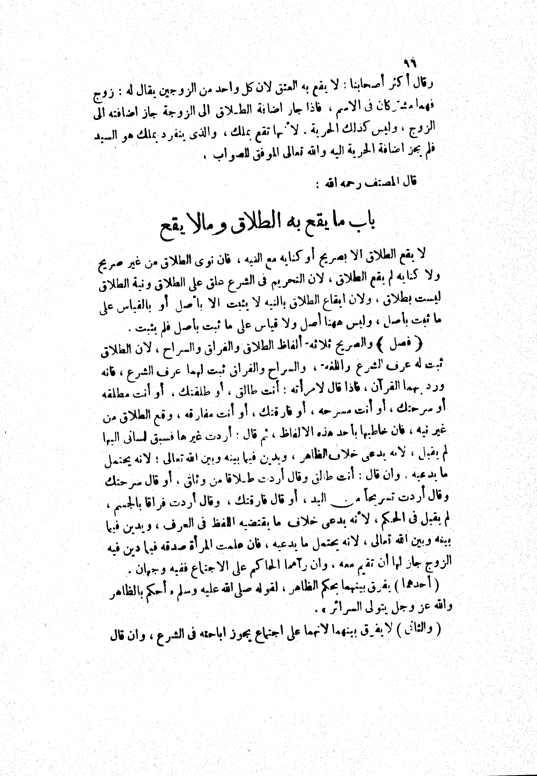 ثبت له عرف الشرع واللغة، والسراح والفراق ثبت لهما عرف الشرع، فانه ورد بهما القرآن، فإذا قال لامرأته: أنت طالق، أو طلقتك، أو أنت مطلقه أو سرحتك، أو أنت مسرحه، أو فارقتك، أو أنت مفارقه، وقع الطلاق من غير نيه، فان خاطبها بأحد هذه الالفاظ، ثم قال: أردت غيرها فسبق لساني إليها لم يقبل، لانه يدعى خلاف الظاهر، ويدين فيما بينه وبين الله تعالى، لانه يحتمل ما يدعيه، وان قال: أنت طالق وقال أردت طلاقا من وثاق، أو قال سرحتك وقال أردت تسريحا من اليد، أو قال فارقتك، وقال أردت فراقا بالجسم، لم يقبل في الحكم، لانه يدعى خلاف ما يقتضيه اللفظ في العرف، ويدين فيما بينه وبين الله تعالى، لانه يحتمل ما يدعيه، فان علمت المرأة صدقه فيما دين فيه الزوج جاز لها أن تقيم معه، وان رآهما الحاكم على الاجتماع ففيه وجهان.
