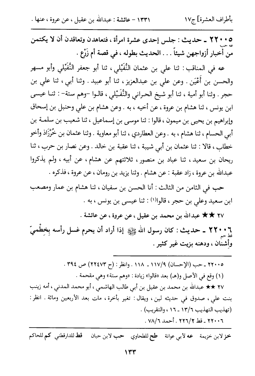 22005 - حديث (عه حب) : جلس إحدى عشرة امرأة، فتعاهدن وتعاقدن أن لا يكتمن من أخبار أزواجهن شيئاً ... الحديث بطوله، في قصة أم زَرْع.