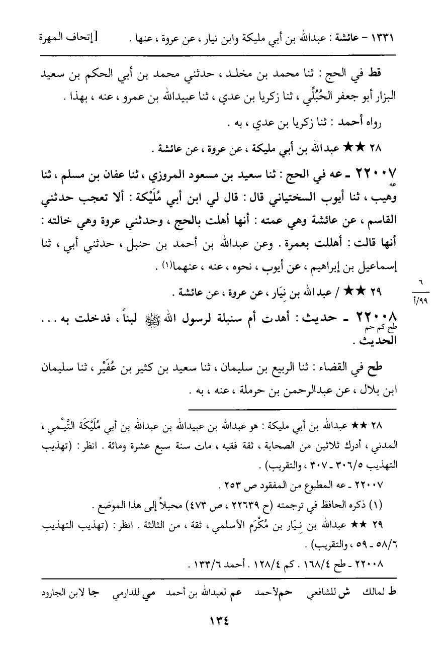 22007 - عه في الحج (عه) : ثنا سعيد بن مسعود المروزي، ثنا عفان بن مسلم، ثنا وهيب، ثنا أيوب السختياني قال: قال لي ابن أبي مُلَيْكة: ألا تعجب حدثني القاسم، عن عائشة وهي عمته: أنها أهلت بالحج، وحدثني عروة وهي خالته: أنها قالت: أهللت بعمرة. وعن عبد الله بن أحمد بن حنبل، حدثني أبي، ثنا إسماعيل بن إبراهيم، عن أيوب، نحوه، عنه، عنهما.